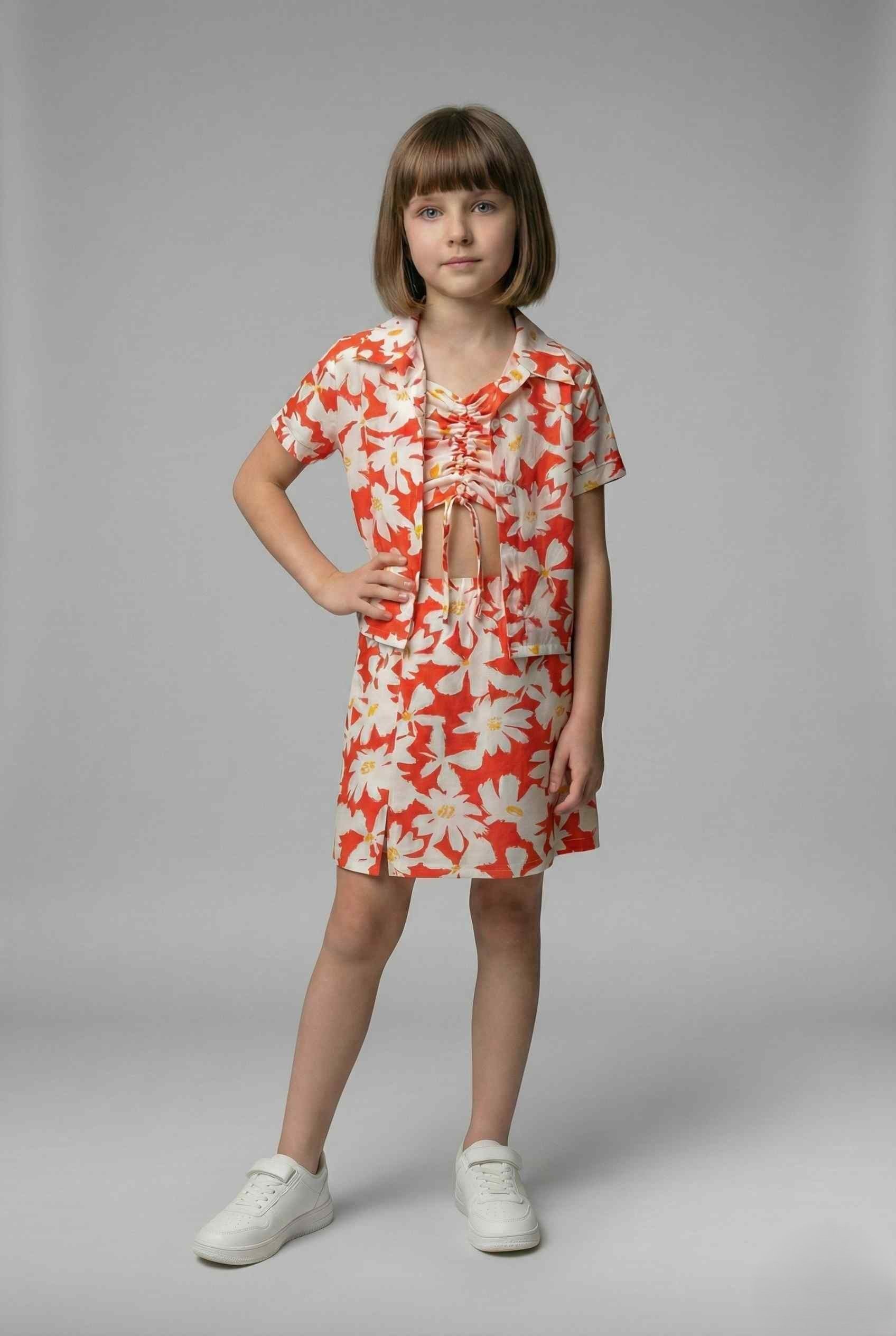 floral printed half sleeves shirt with matching singlet ruched crop top and Skirt set-Red/Multi