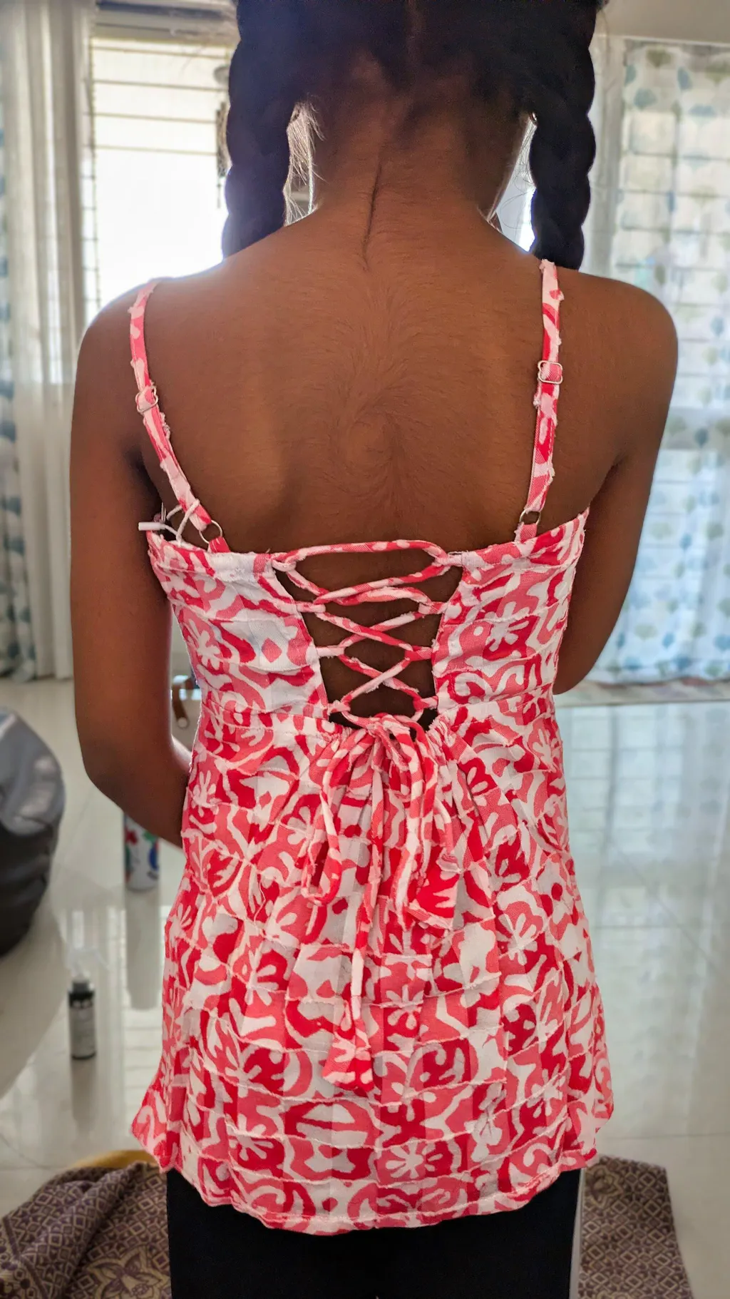 100% cotton woven sleeveless Abstract Printed back tie up top- Red & white