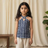 Cotton stripes embroidered abstract printed halter neck tie up front cut out detail kurti