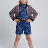 abstract printed full sleeves zip up jacket with printed sleeveless crop top and shorts set-Pink/Blue