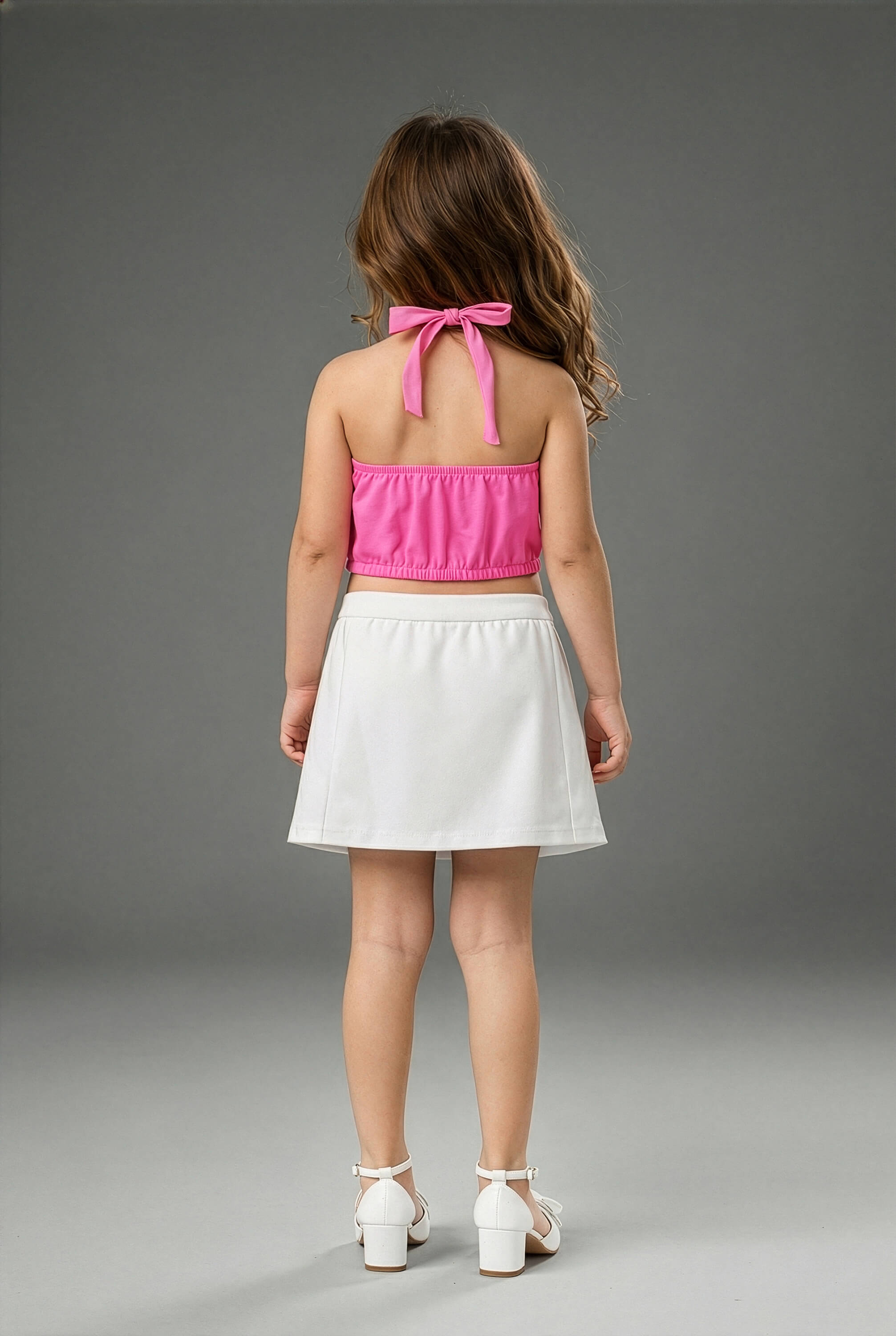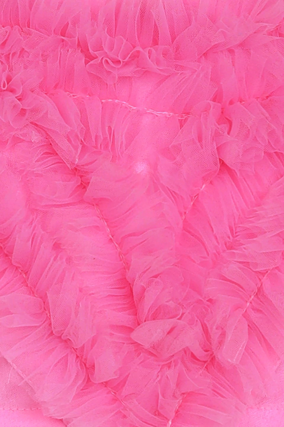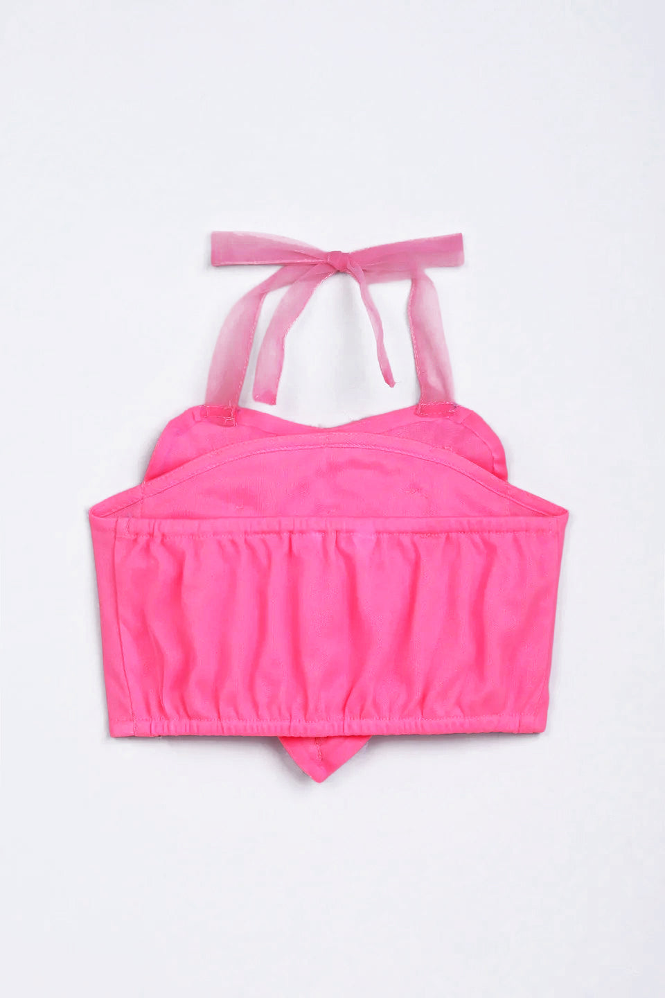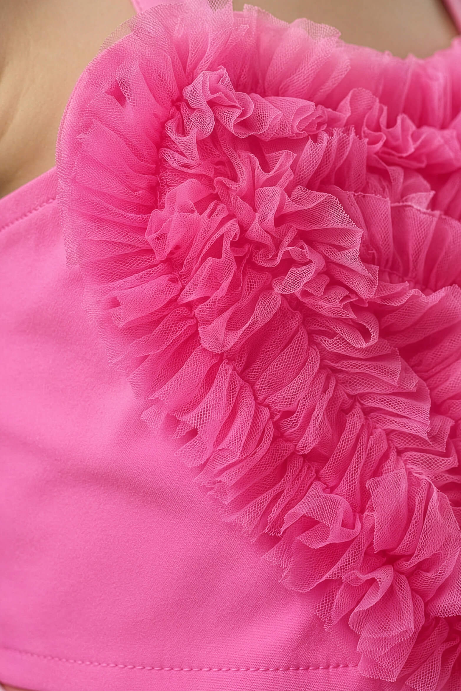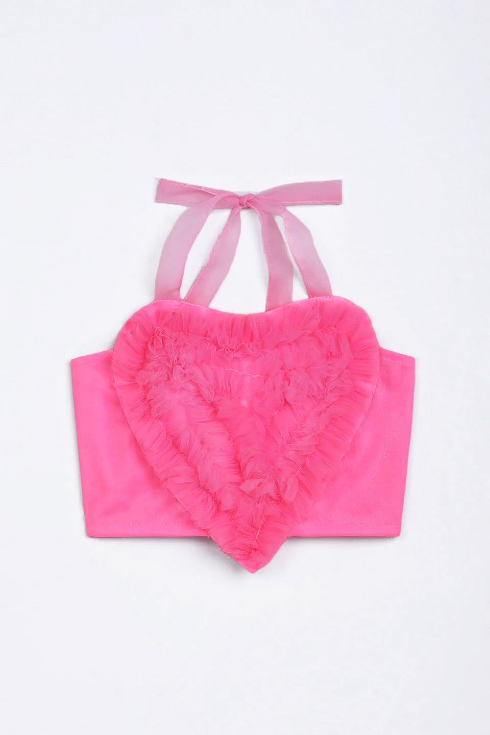 Net knit sleeveless party crop top with heart ruffle applique in pink featuring a back tie up detail for a bold statement must have look