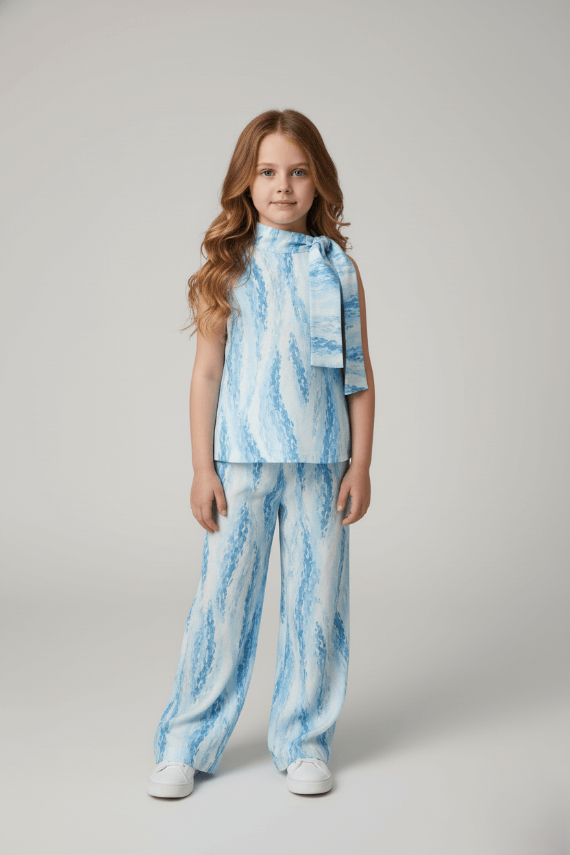 sleeveless abstract printed Scarf neck Aline top and pant set- Blue and white
