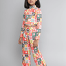 Retro floral printed full sleeves waist tie up crop top with matching pant set-Multi