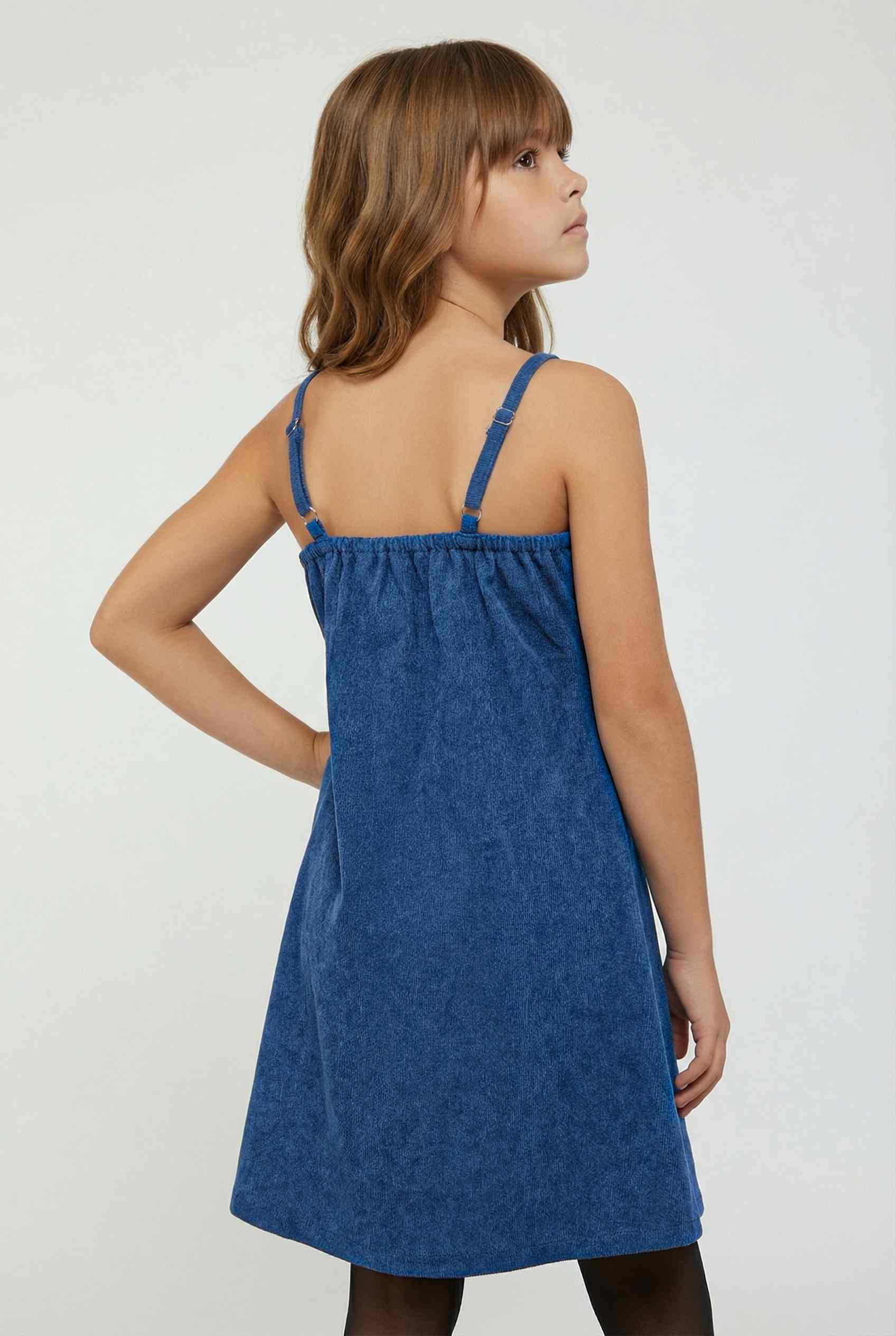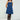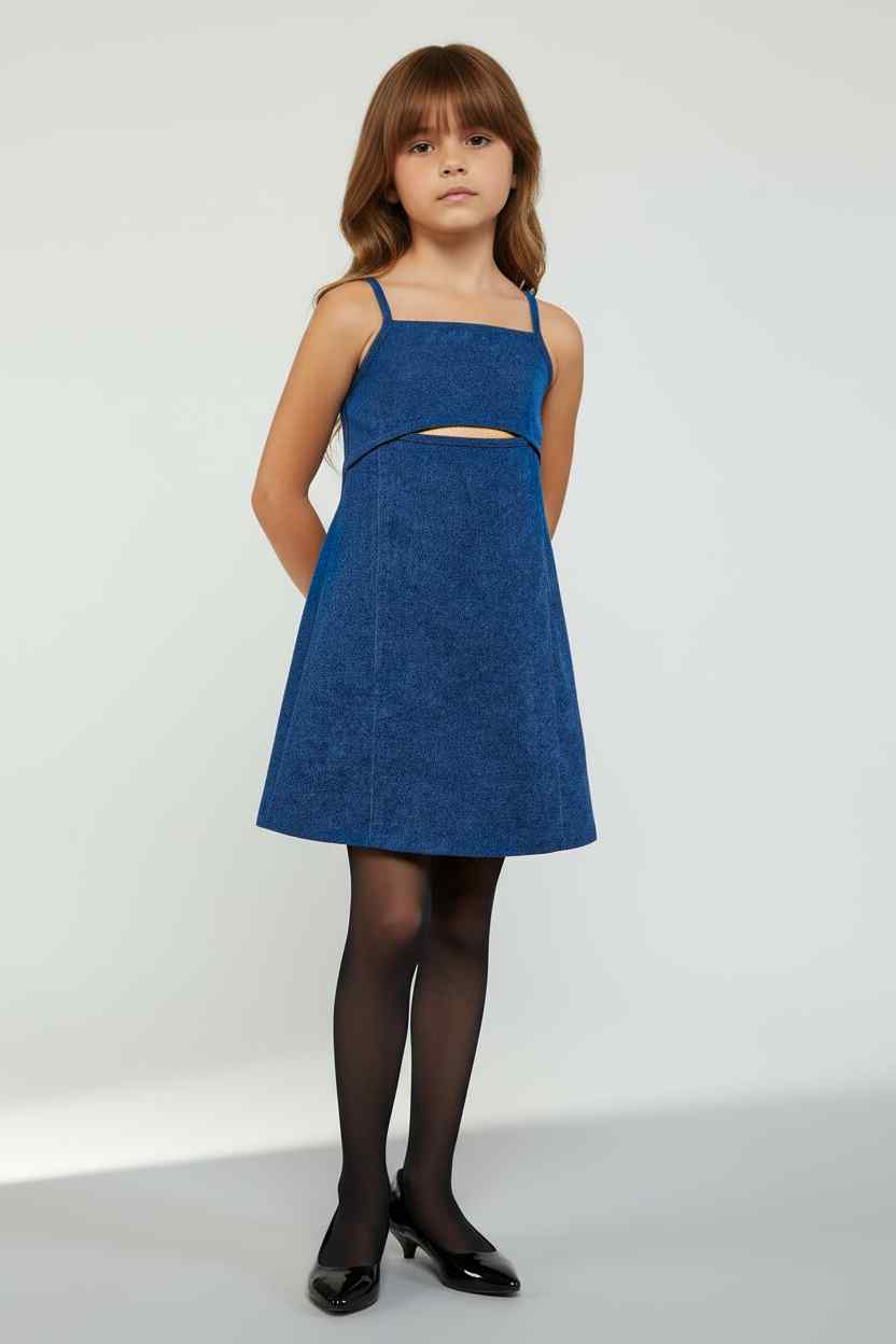 A blue corduroy sleeveless dress with front cut out detail for a trendy and modern appeal.