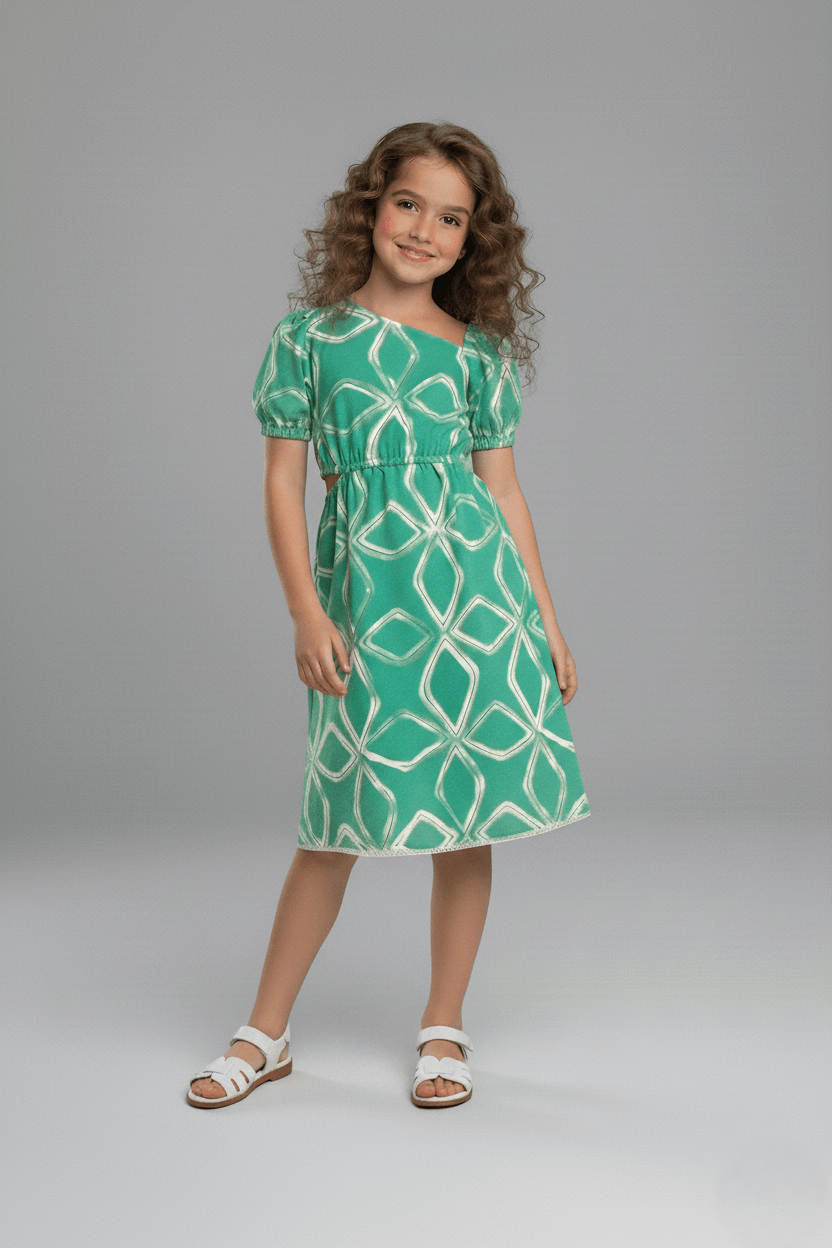 Cotton Puff Sleeve Printed Asymmetric Neck and Waist Cut-Out Detail Dress – Green & White