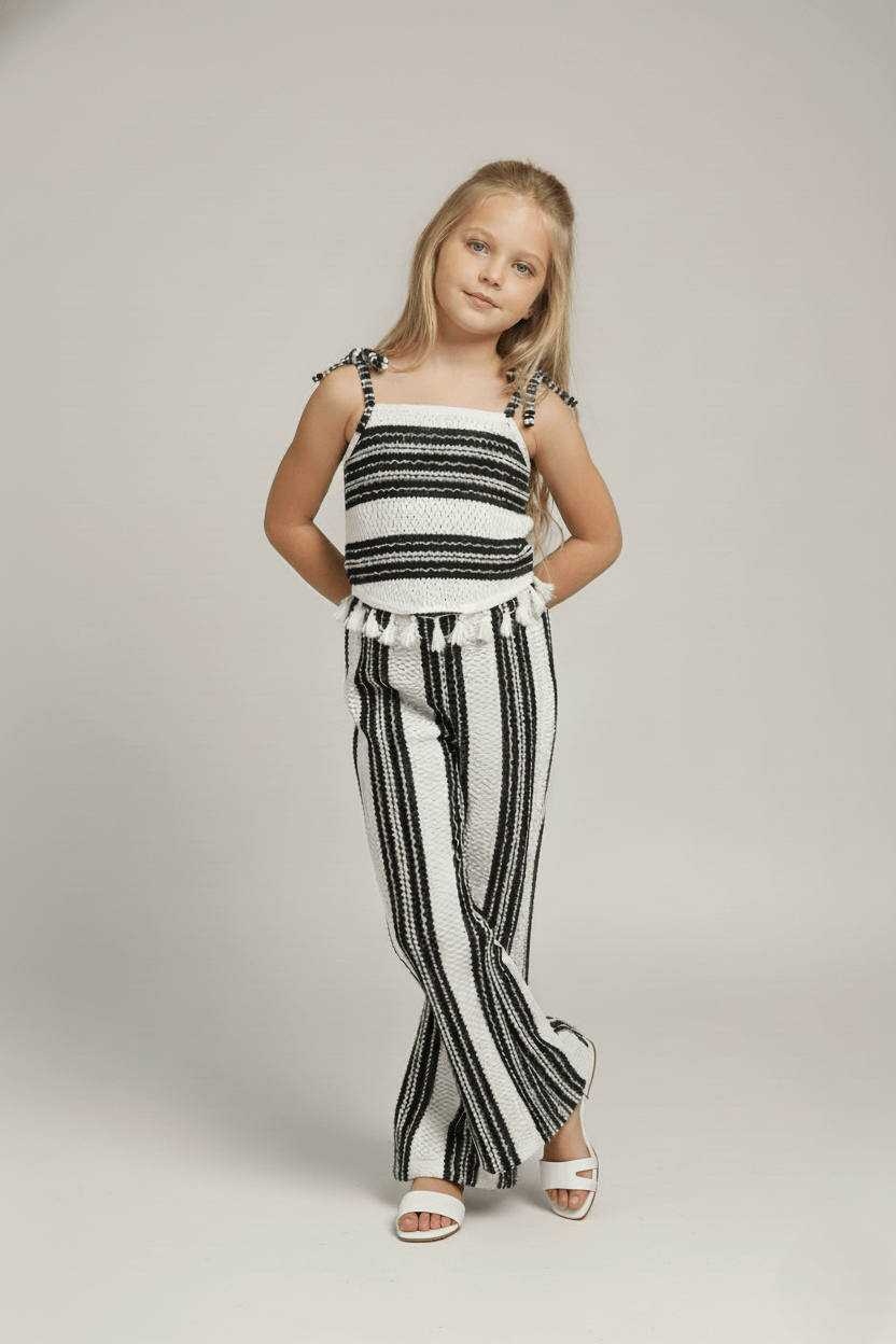Crochet sleeveless striped shoulder tie-up top with matching flared pants in cream and black, a must-have summer beach style set.
