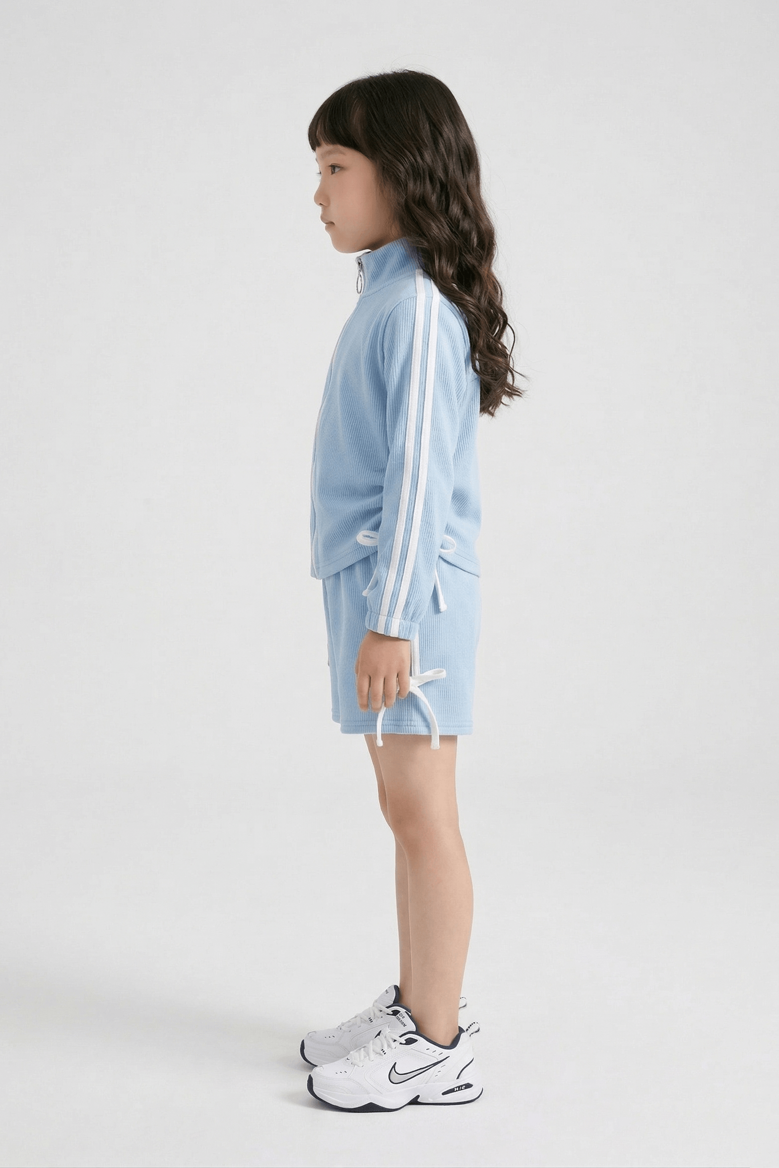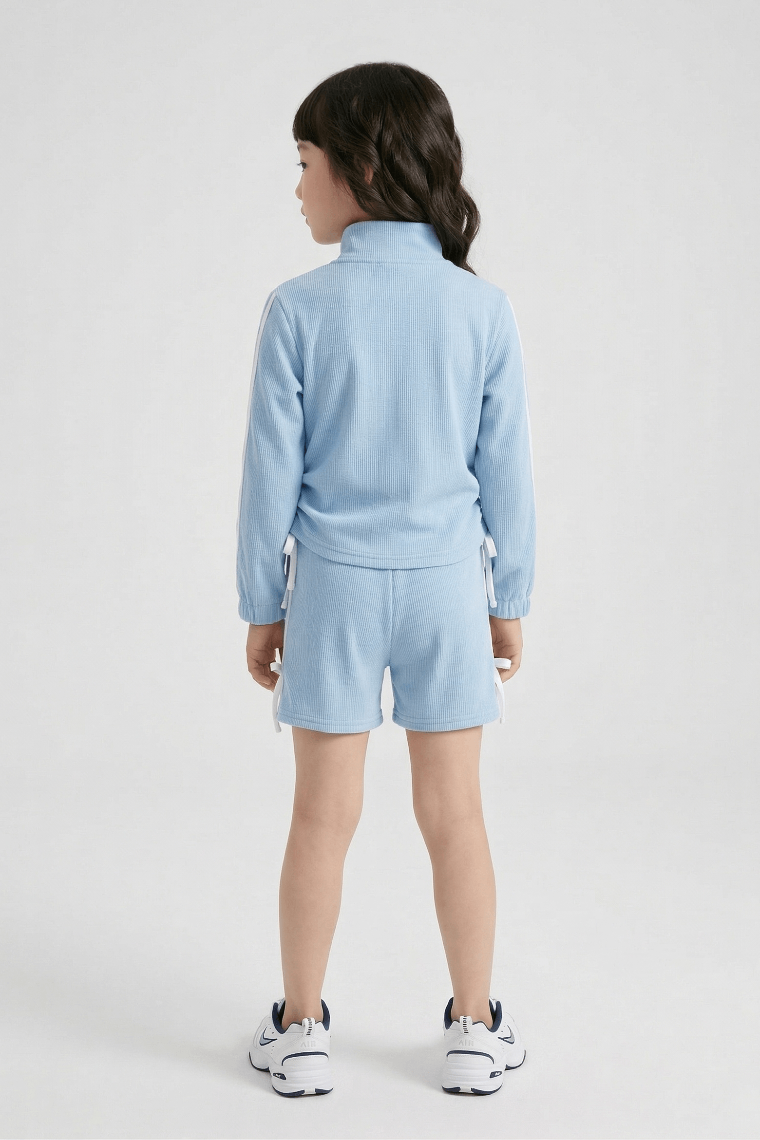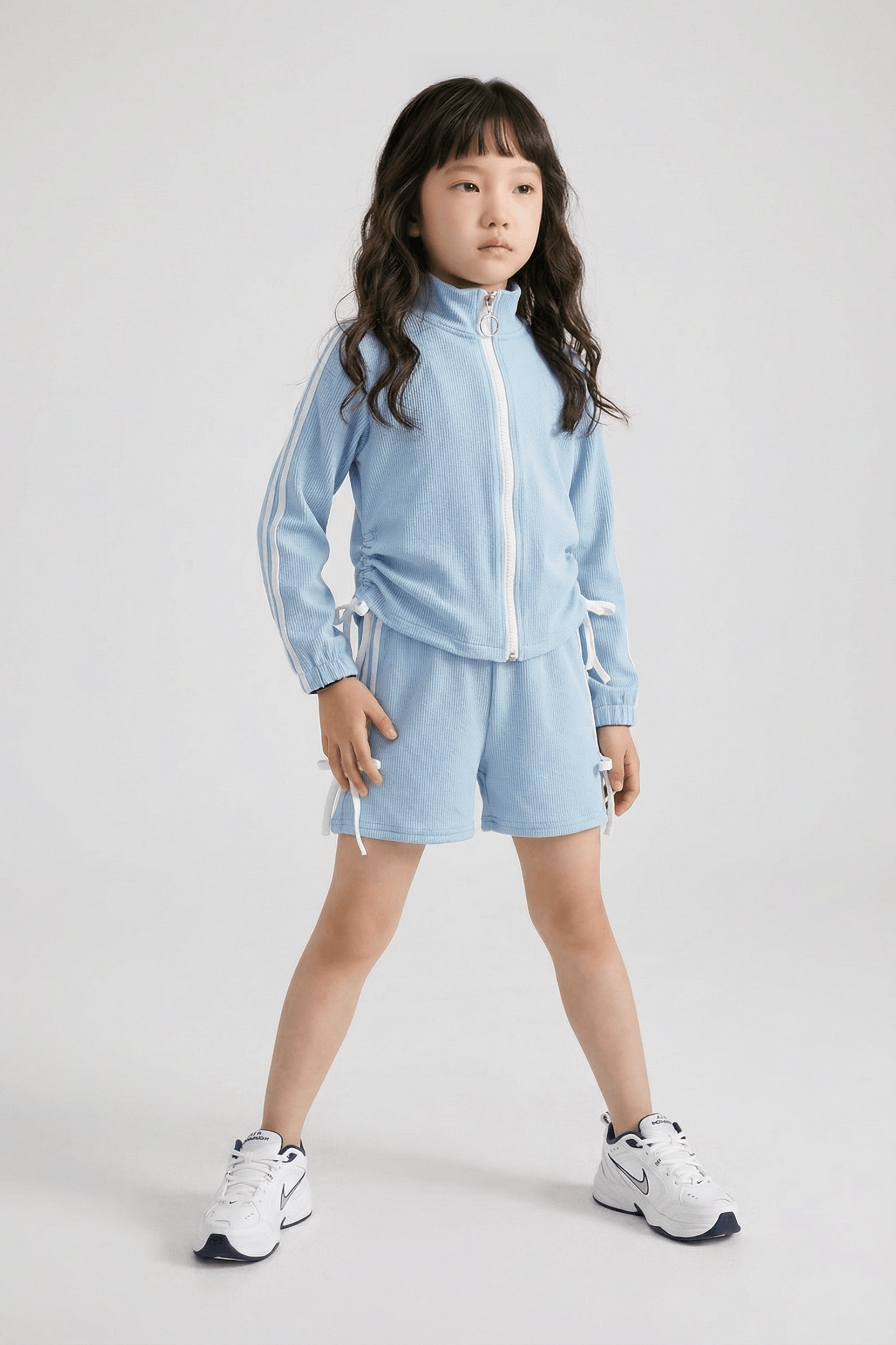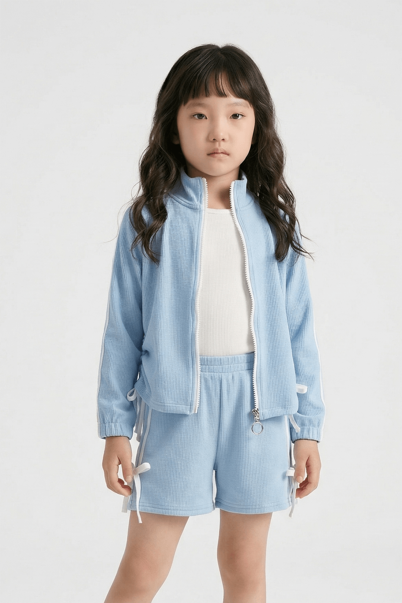 knit full sleeves front zipper jacket with drawstring detail paired with double tape shorts featuring bow tie up accents in a blue and white palette for a sporty yet cute look.