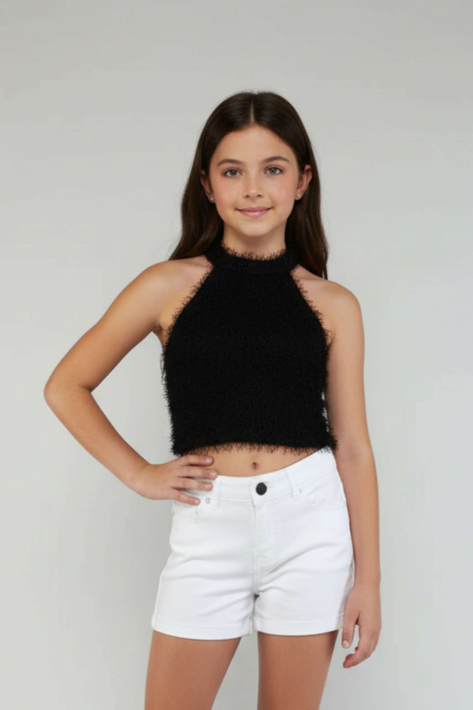 Knit Fur Sleeveless Halter neck party Top - Black
