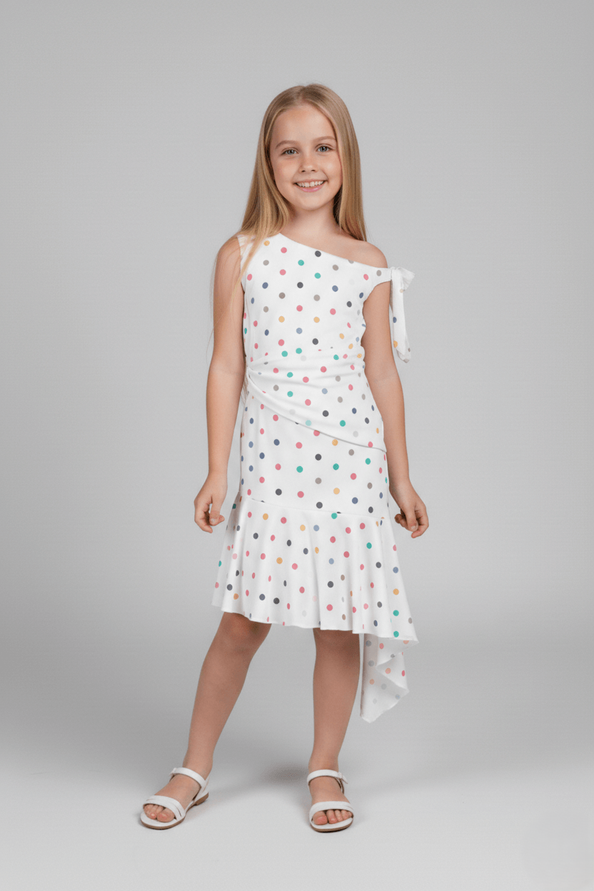 Knit Polka dot One shoulder Tie up detail Top with Matching Asymmetric skirt set - White/Multi