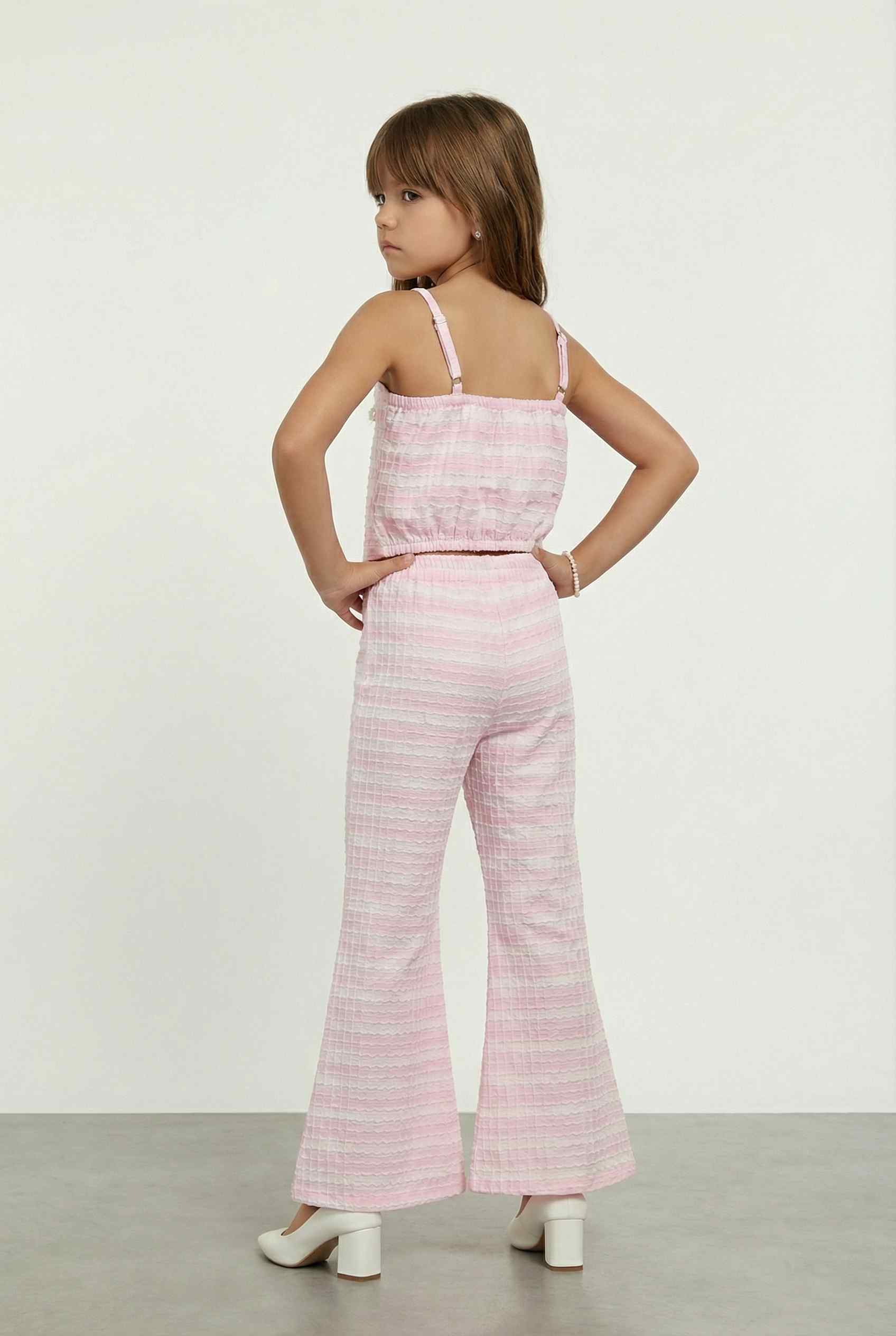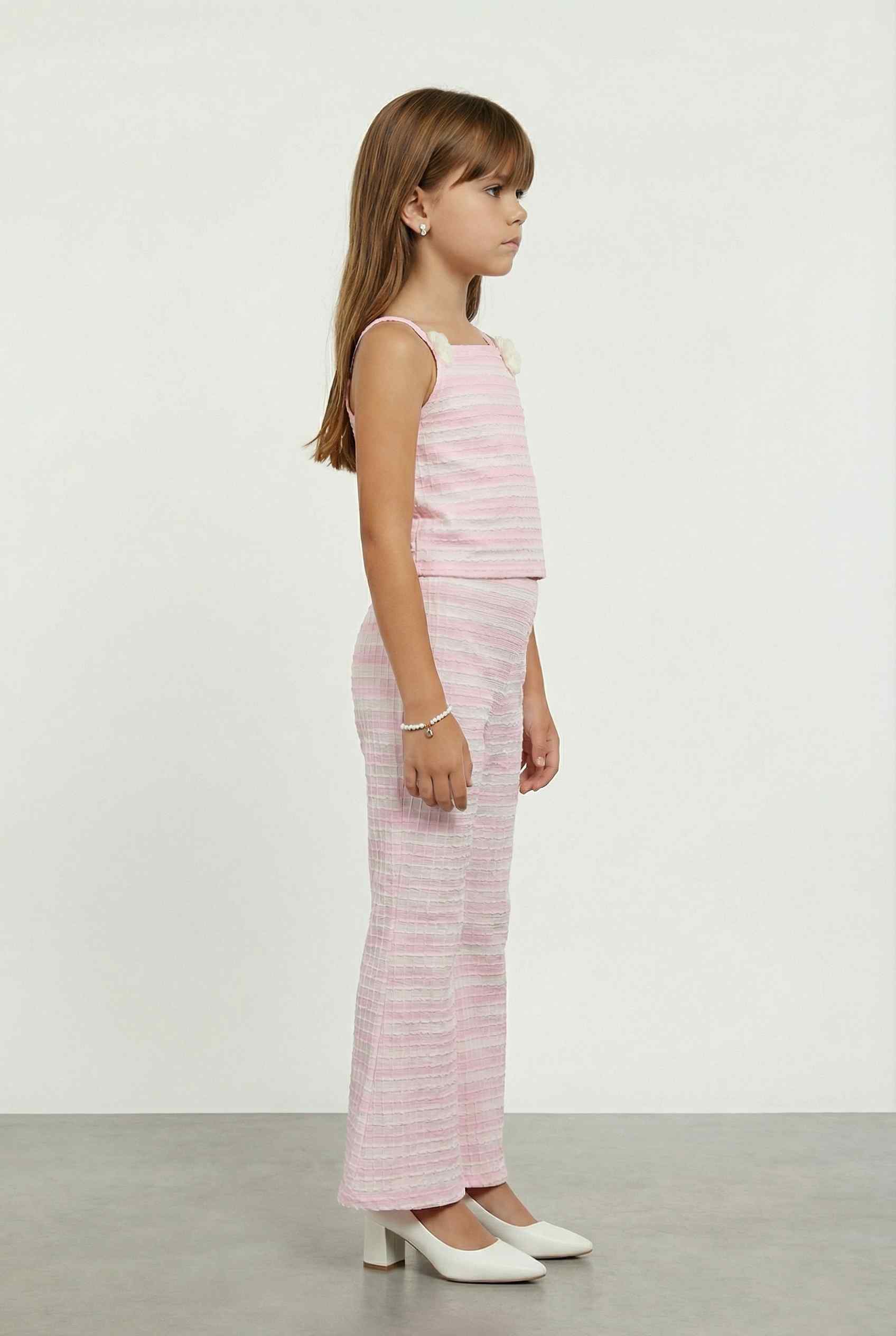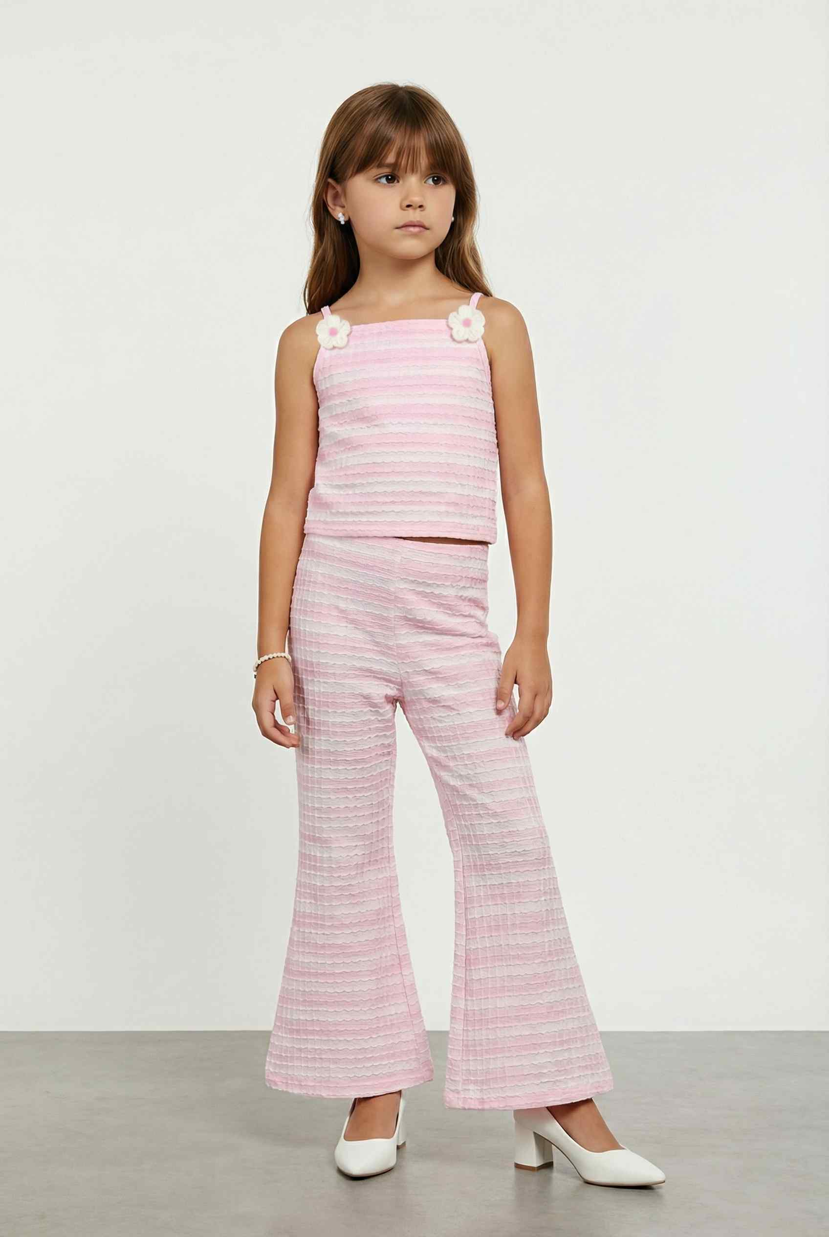 A casual chill co ord set featuring a knit sleeveless singlet top with flower embellishment paired with matching flared pants in soft pink hues.