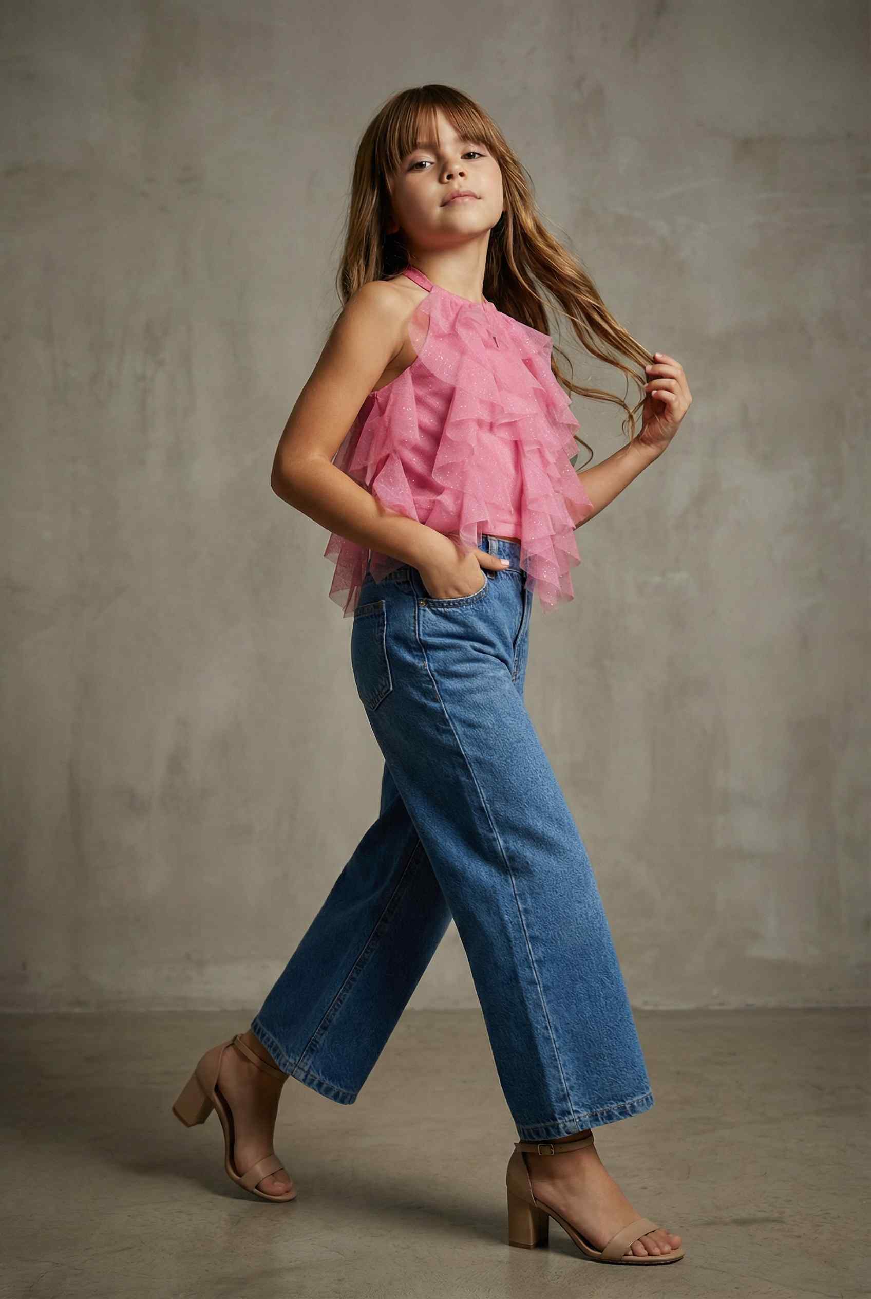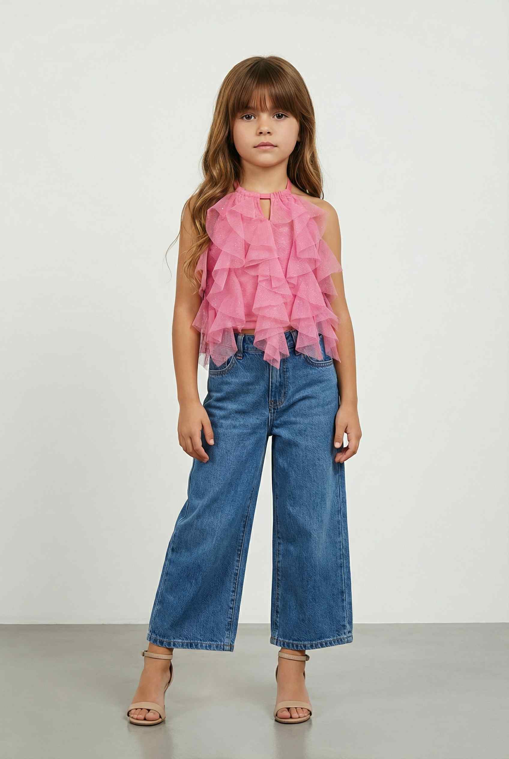 A pink sleeveless glitter knit halter neck top with front ruffle detail for a chic look