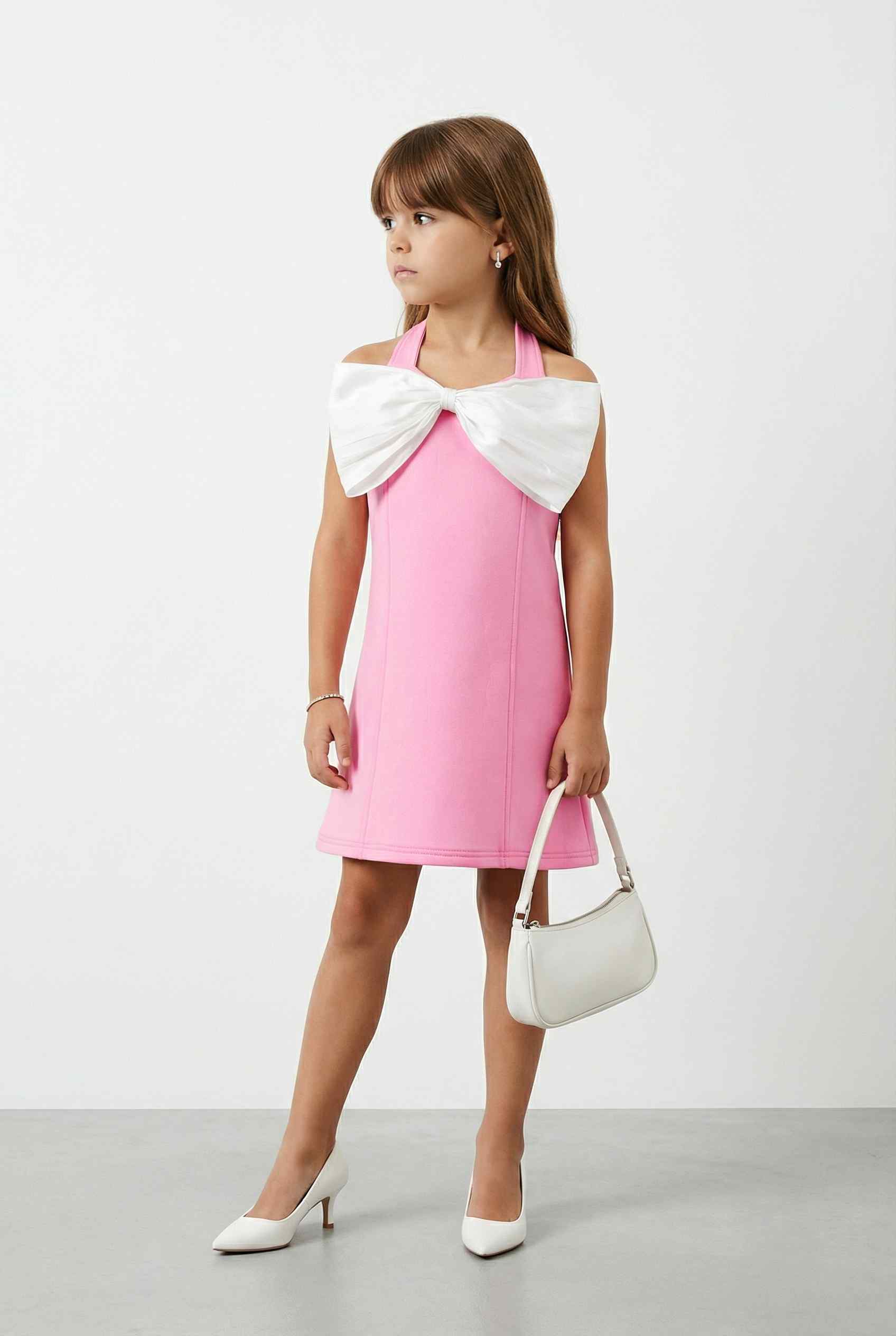 Knit sleeveless halter neck A line dress in pink and white featuring a bow detail for a sweet and stylish statement look