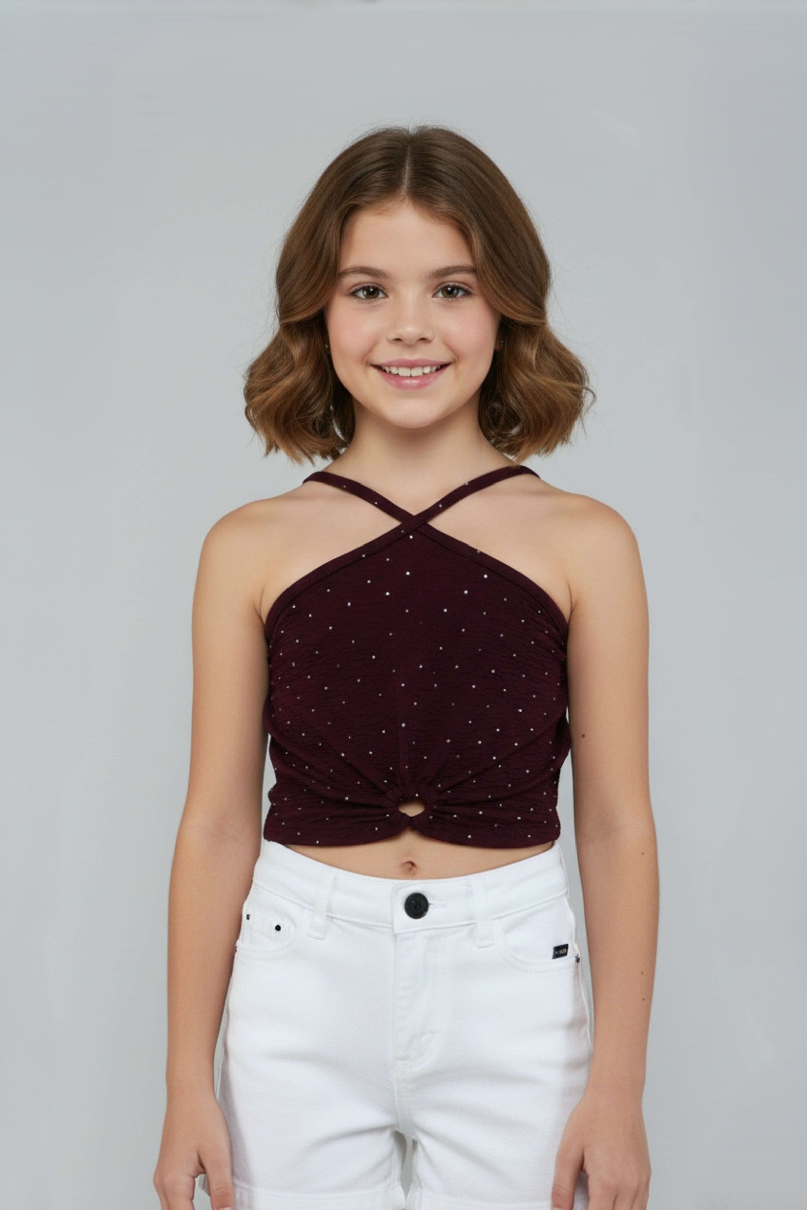 Wine colored knit sleeveless halter neck top with a subtle cut out and glitter detail for an easy party-ready basic.