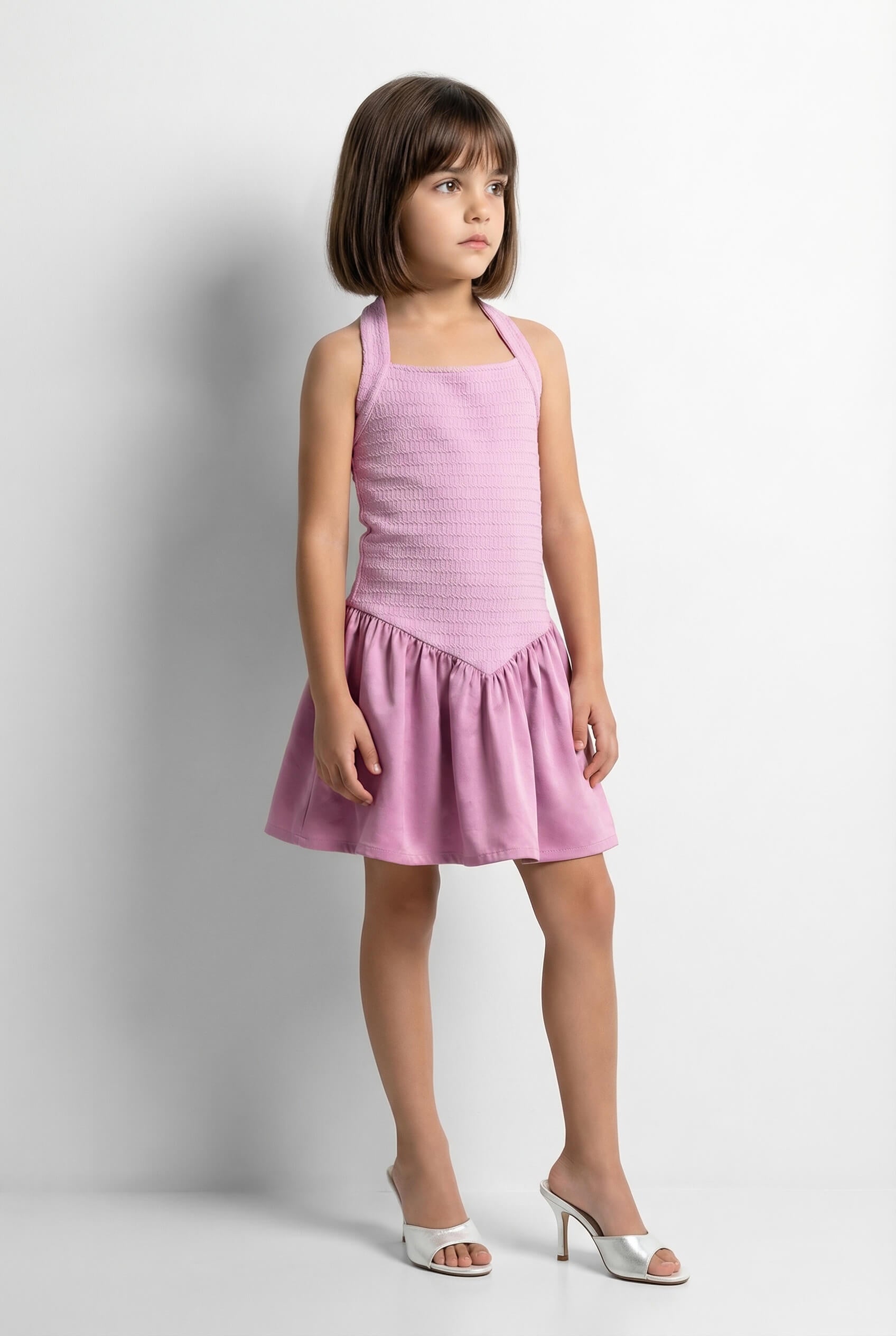A purple knit sleeveless halter neck dress with a V waistline and flattering A line silhouette for an elegant look.