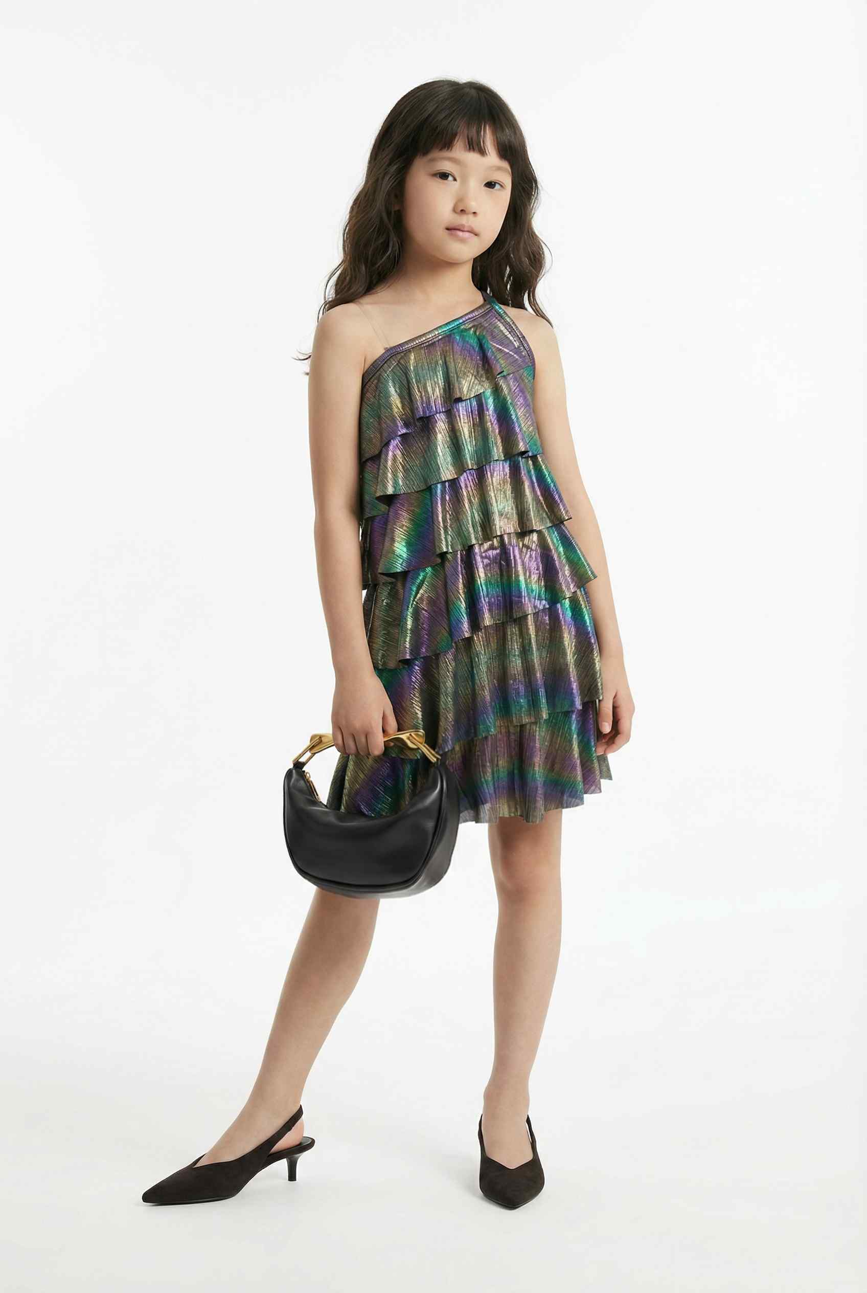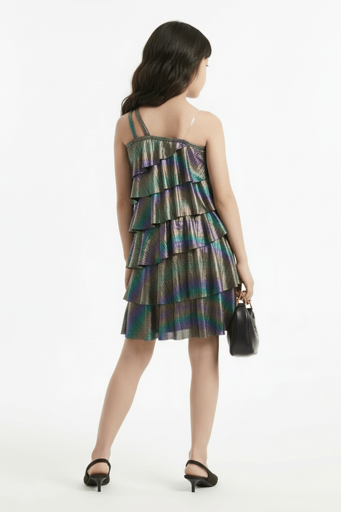Multi color sleeveless party dress featuring a holographic finish with an asymmetric layered silhouette