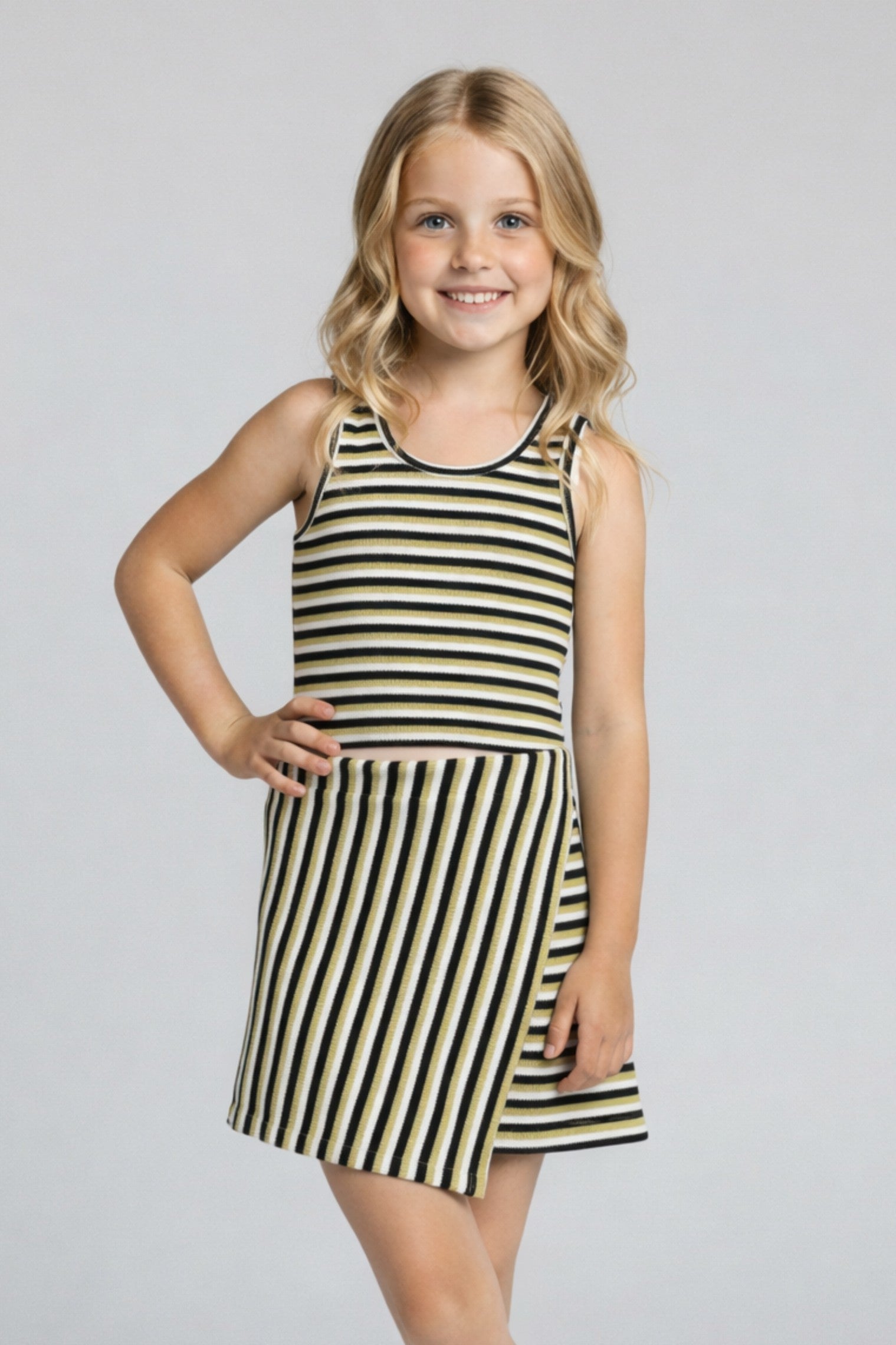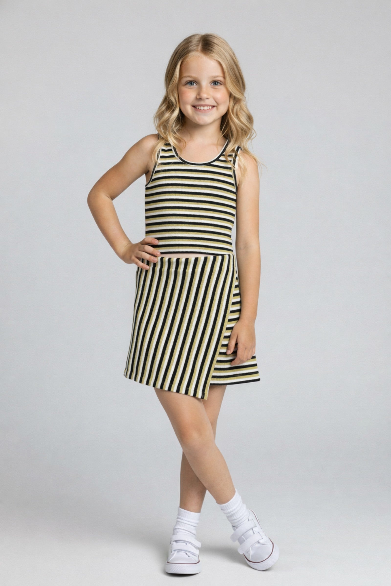 A vibrant green and multi striped knit halter neck set featuring a sleeveless halter neck top paired with matching skorts for an easy playful look