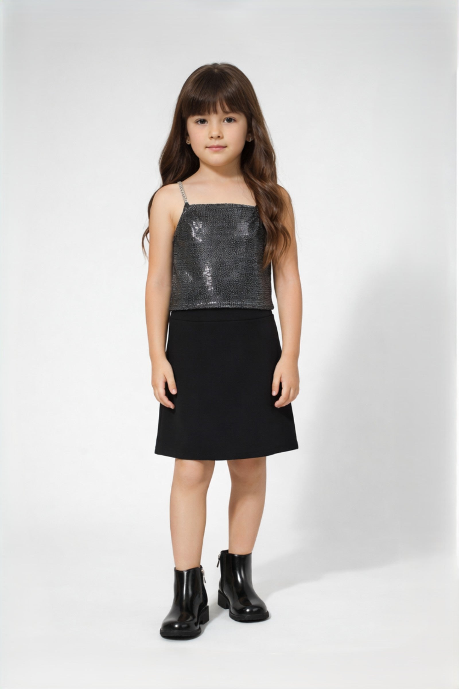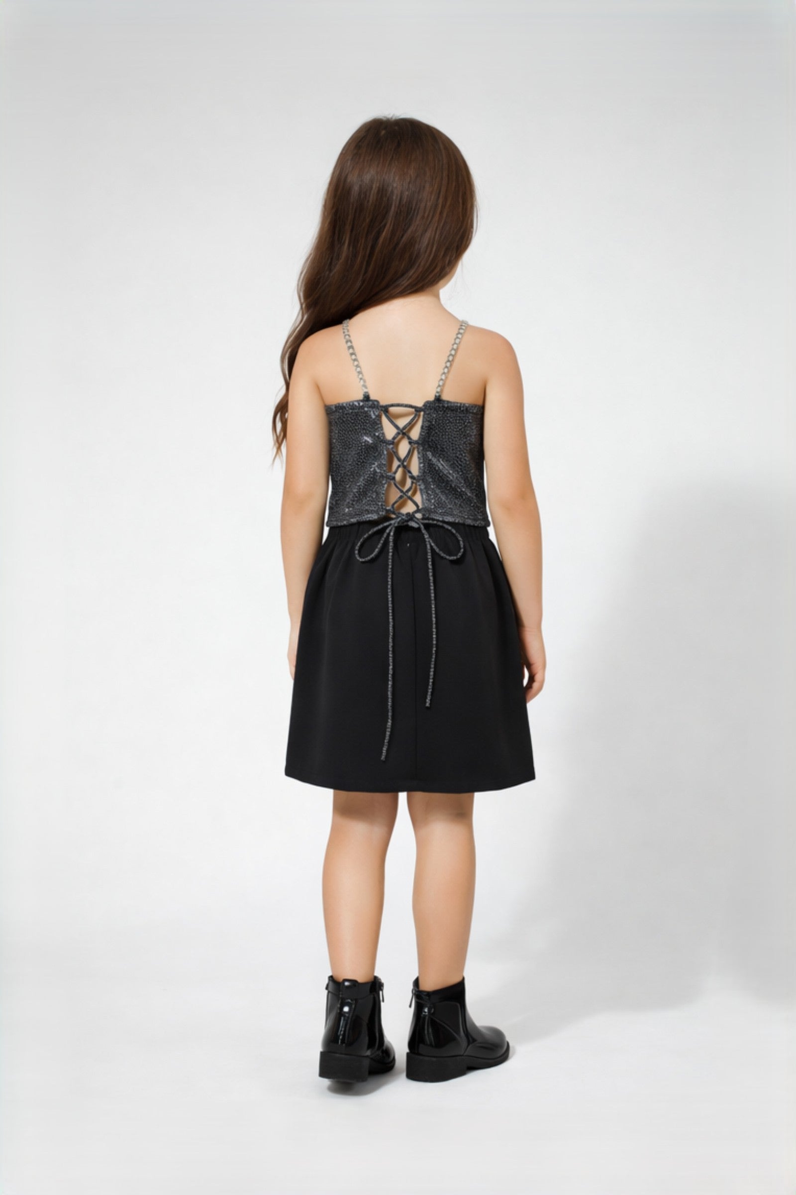 Metallic Sleeveless Chain strap detail Singlet Party and Solid Skirt set - Silver & Black