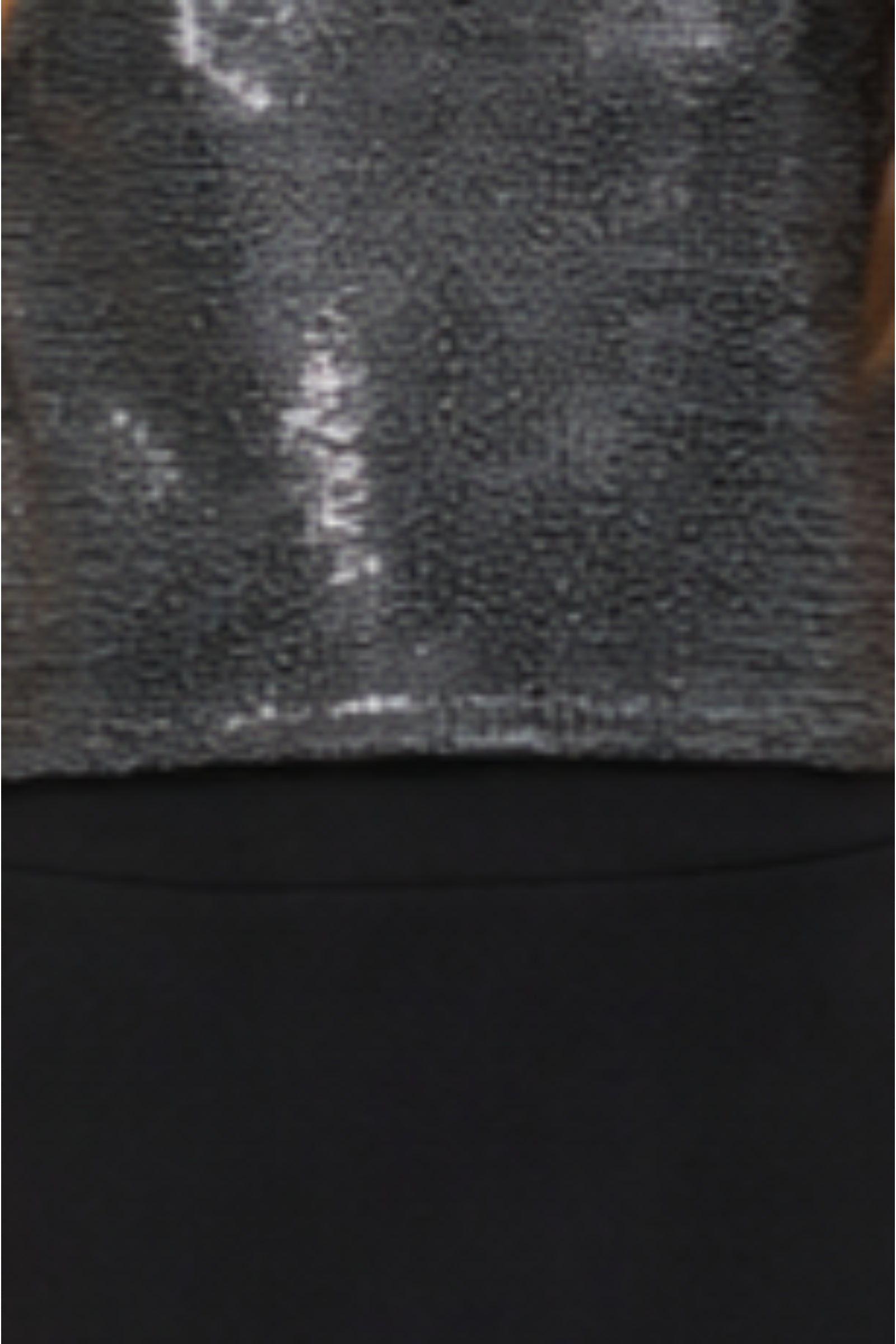 A silver and black metallic shimmer sleeveless singlet party top with chain strap detailing and a back tie up for a bold statement look with Solid Black skirt.