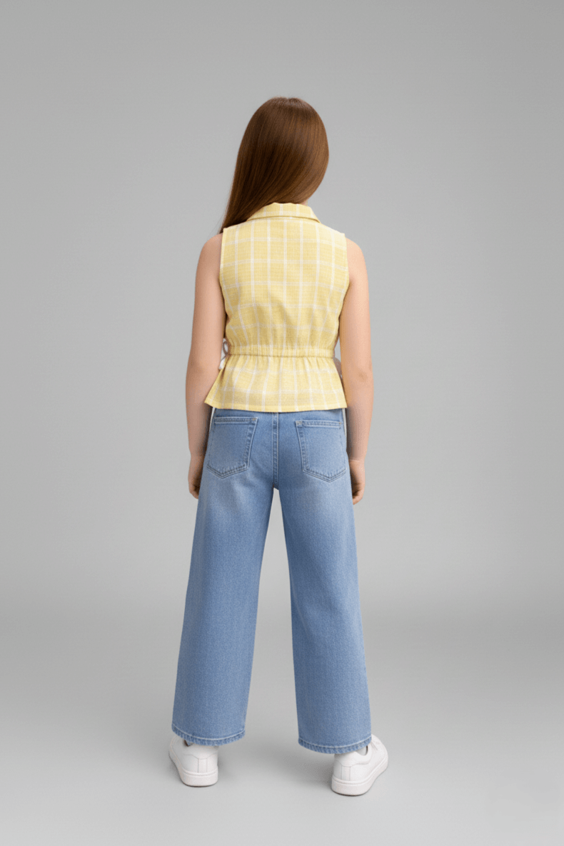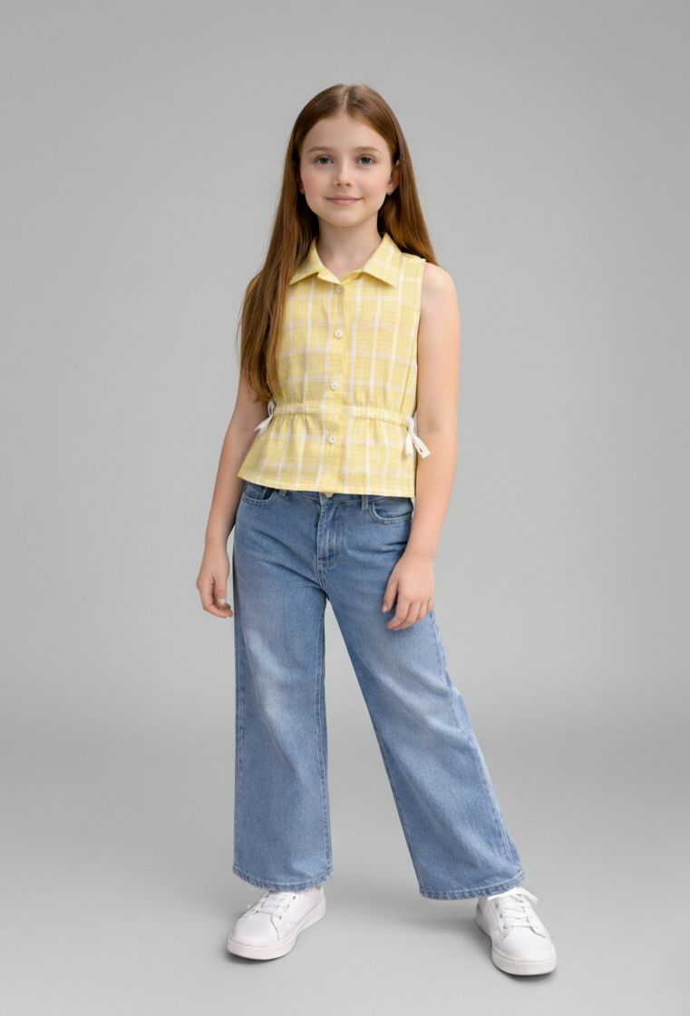 Woven Checked Print Shirt with Elasticated Waist and Bow Detail – Yellow & White
