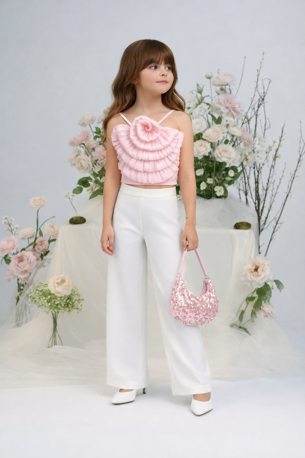 A dreamy baby pink woven organza sleeveless party top adorned with rose detailing for a soft, elegant and statement making look.