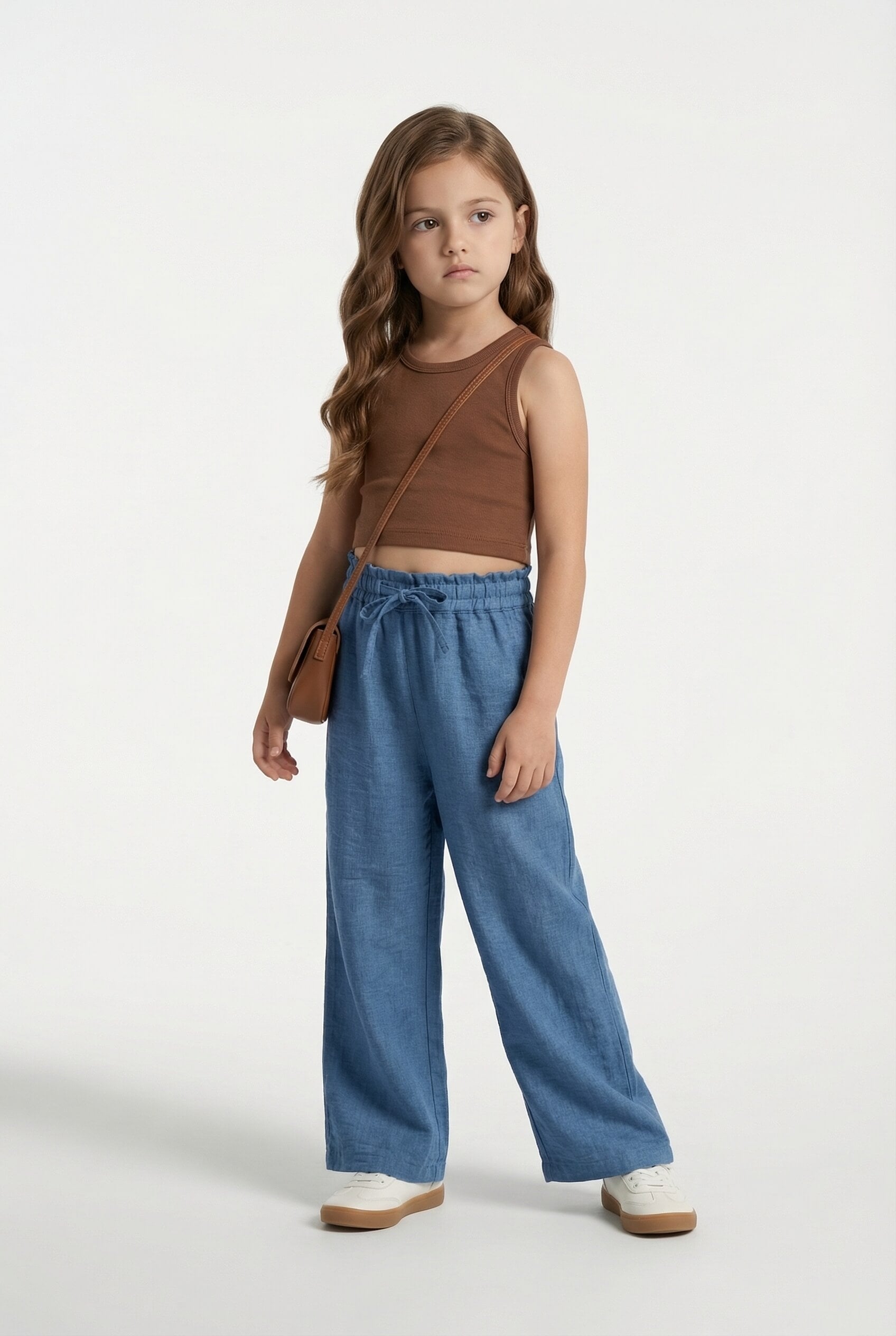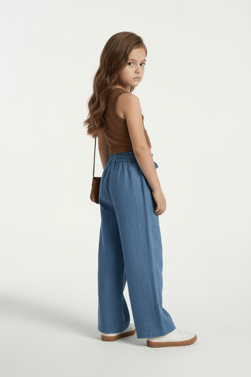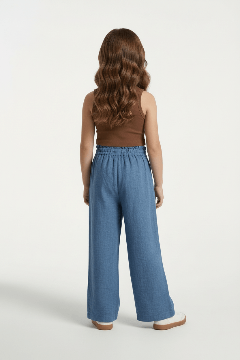 Woven Paperbag Waist Drawstring Detail Full length Pants - Blue