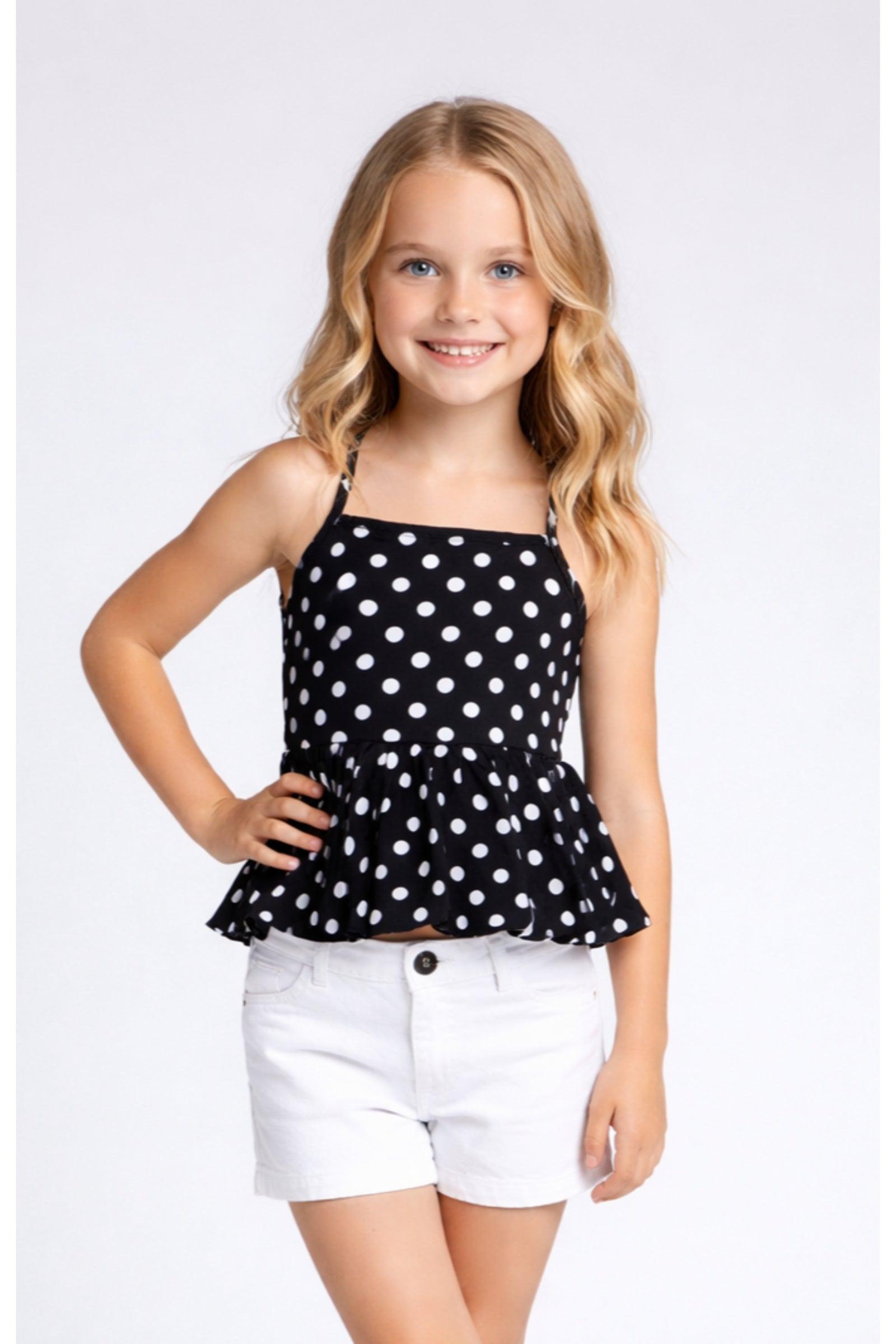 Woven polka dot print sleeveless bubble hem top in black and white for a trendy statement look