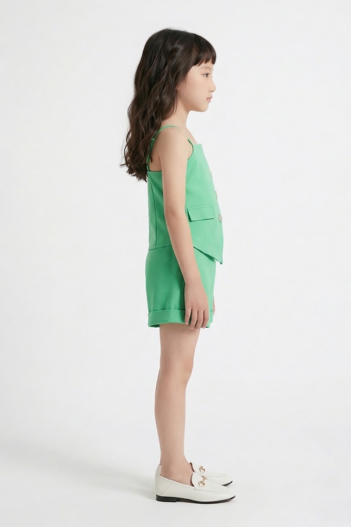 Woven Sleeveless Asymmetric Detail Waistcoat and Matching shorts Set - Green