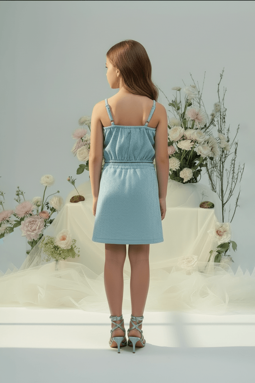 A stylish blue set featuring a woven sleeveless flower applique top paired with a matching front slit skirt for an elegant party look