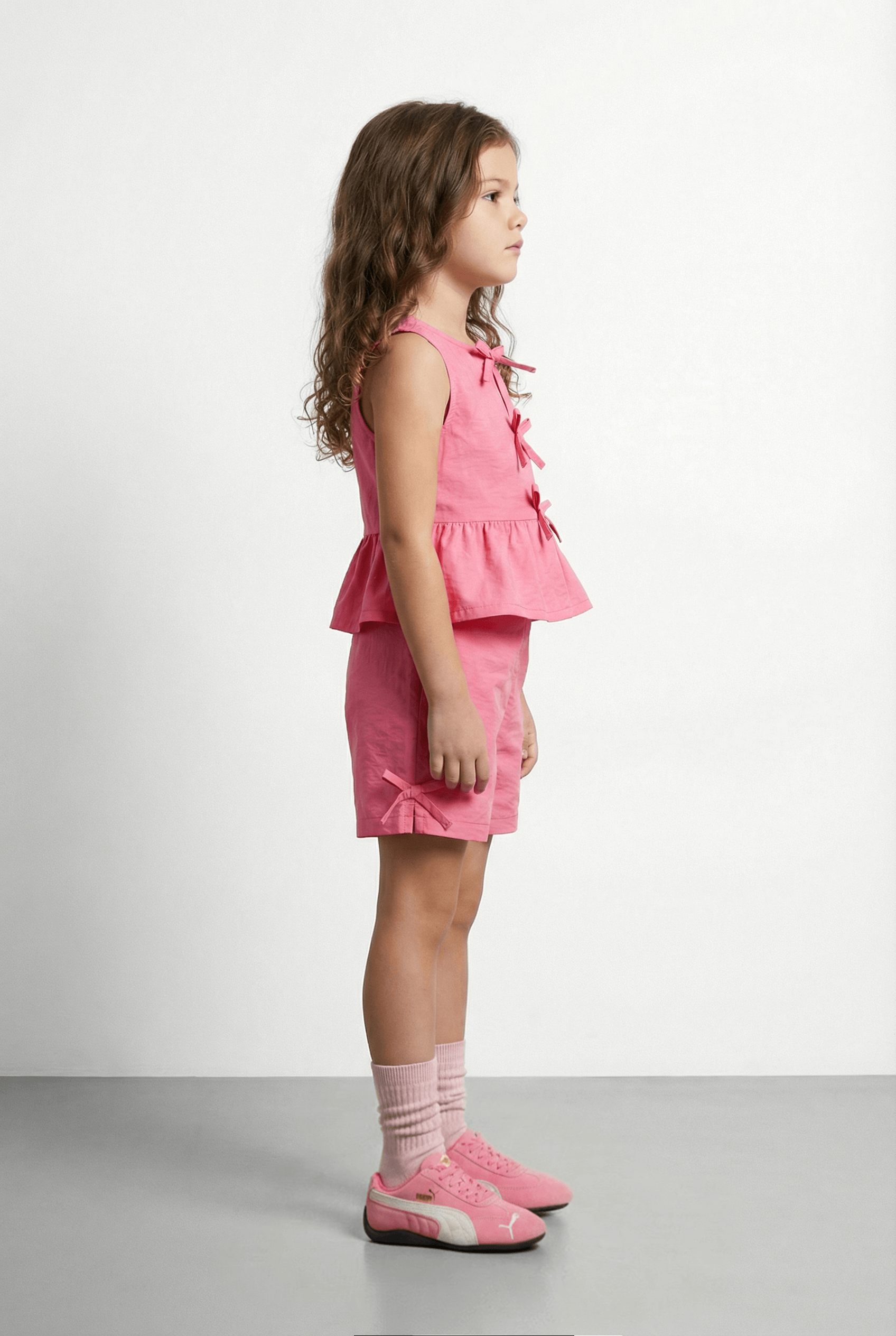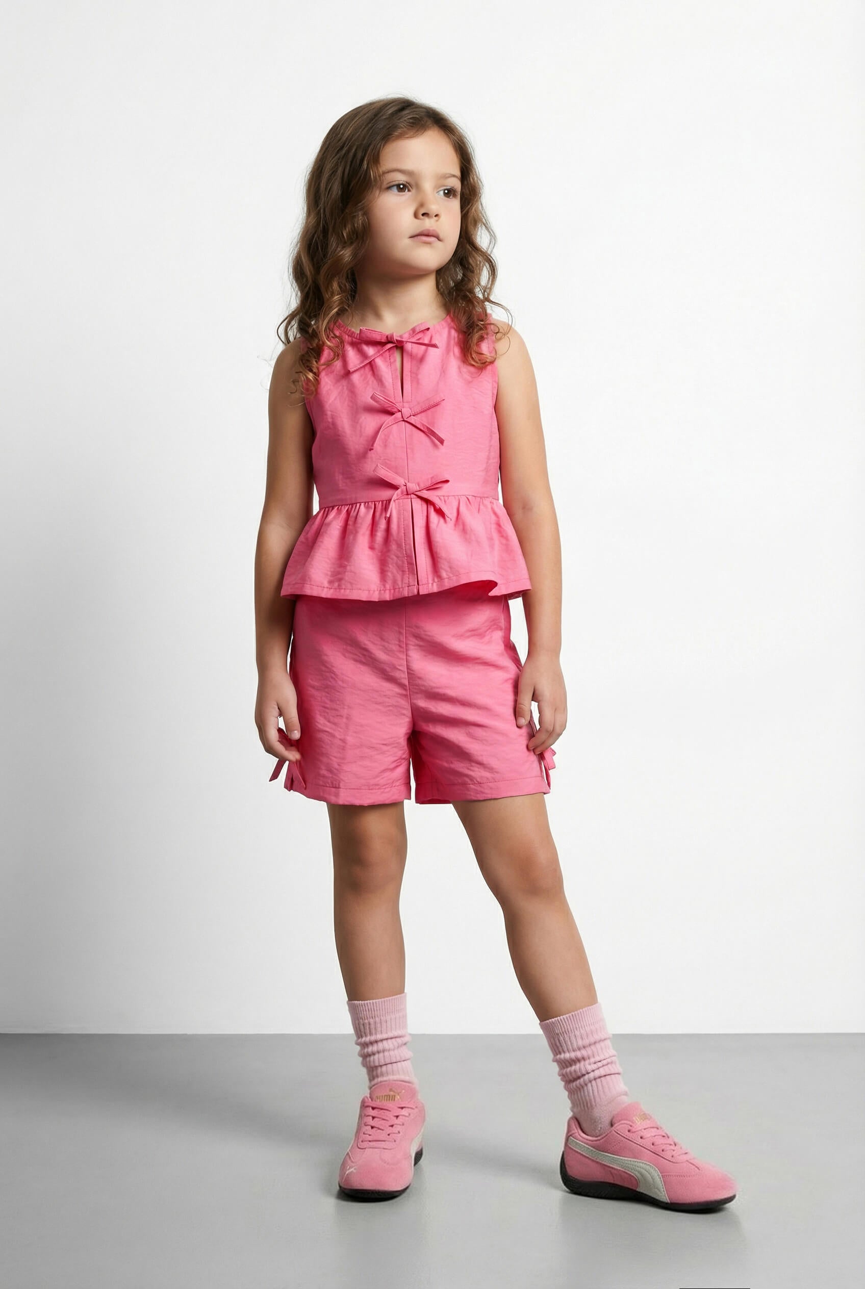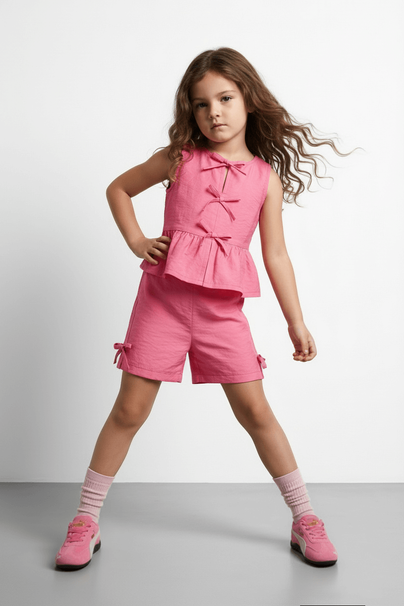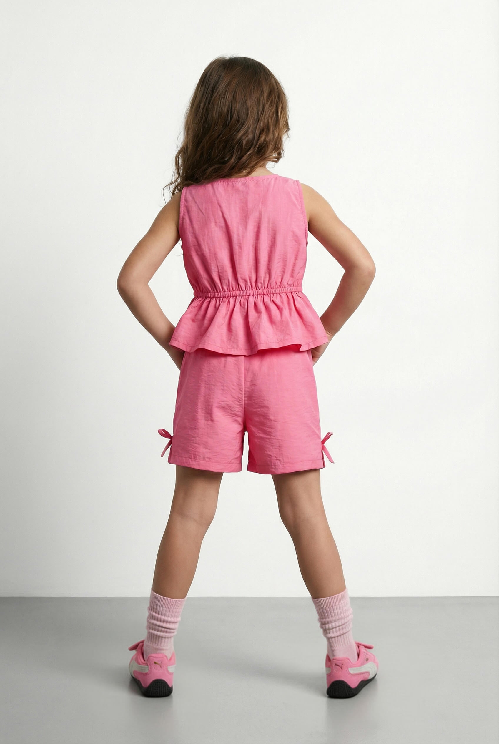 A chic pink woven sleeveless frill top with front bow detail paired with matching shorts for a playful and stylish look.