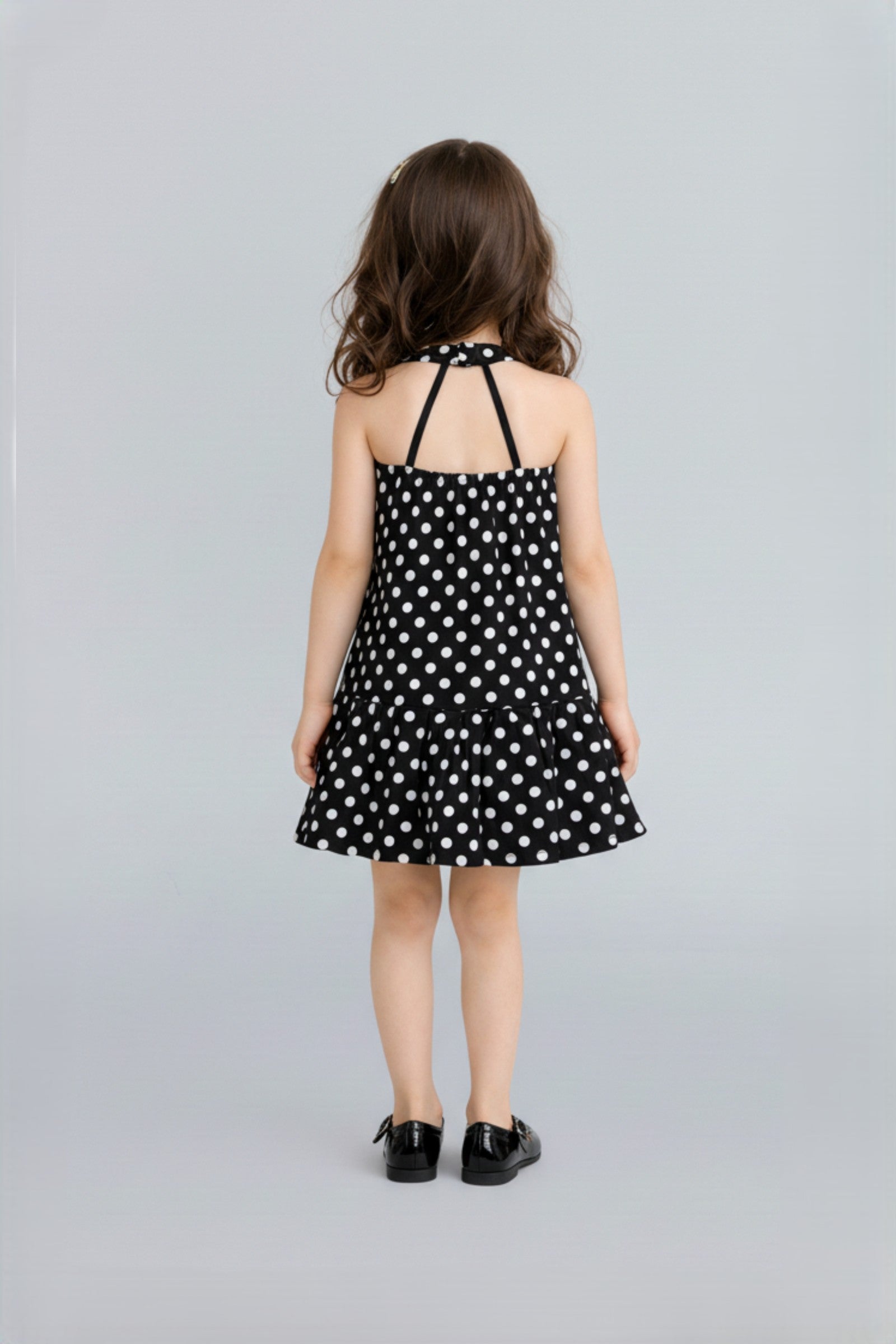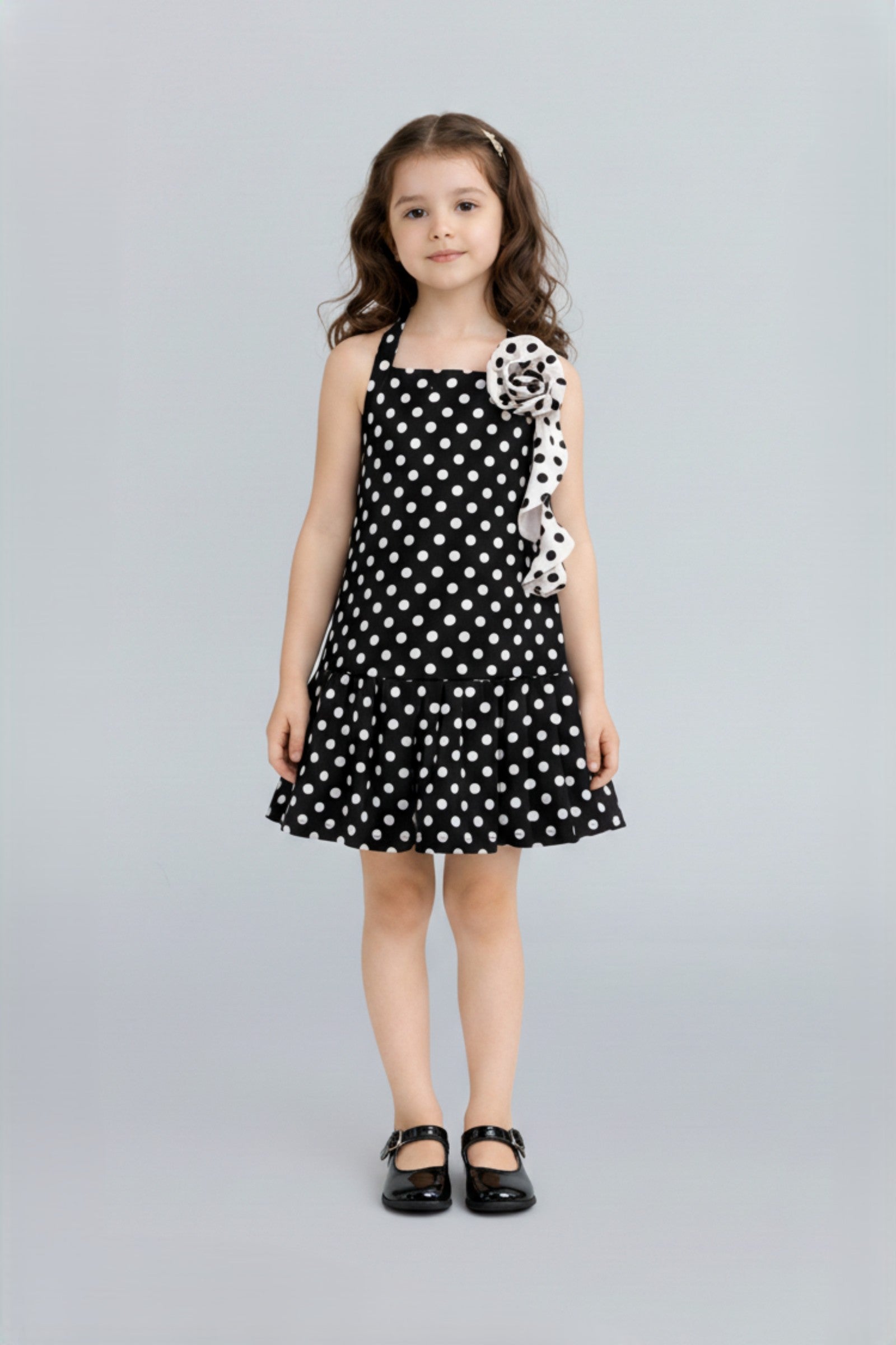 Woven Sleeveless Polka dot print Pleated hem with flower detail Party dress- Black & White