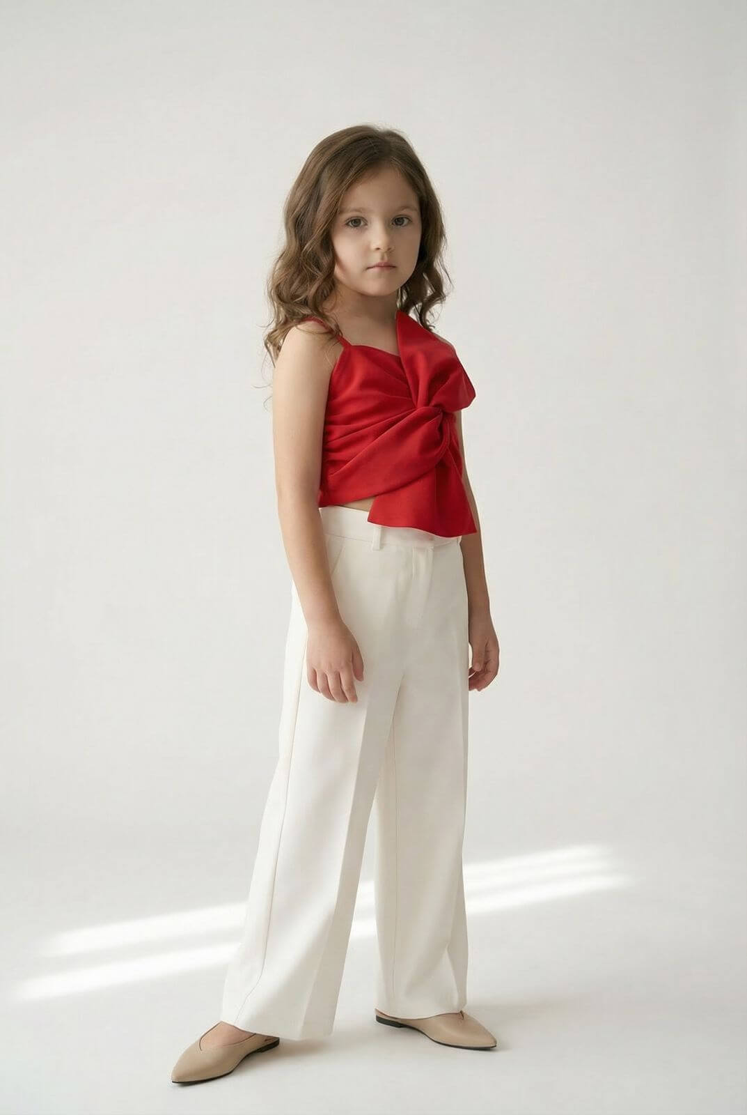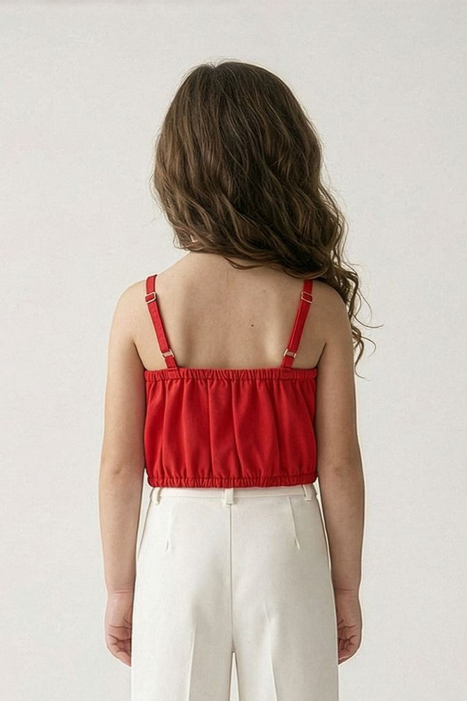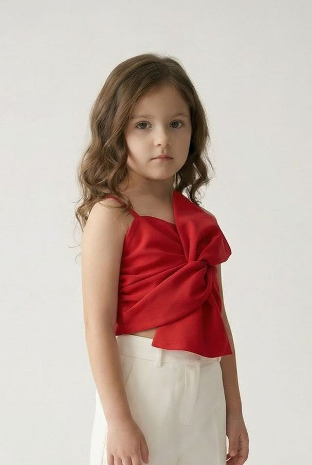 Woven sleeveless solid red crop top with bow detail, a bold statement piece for party looks.