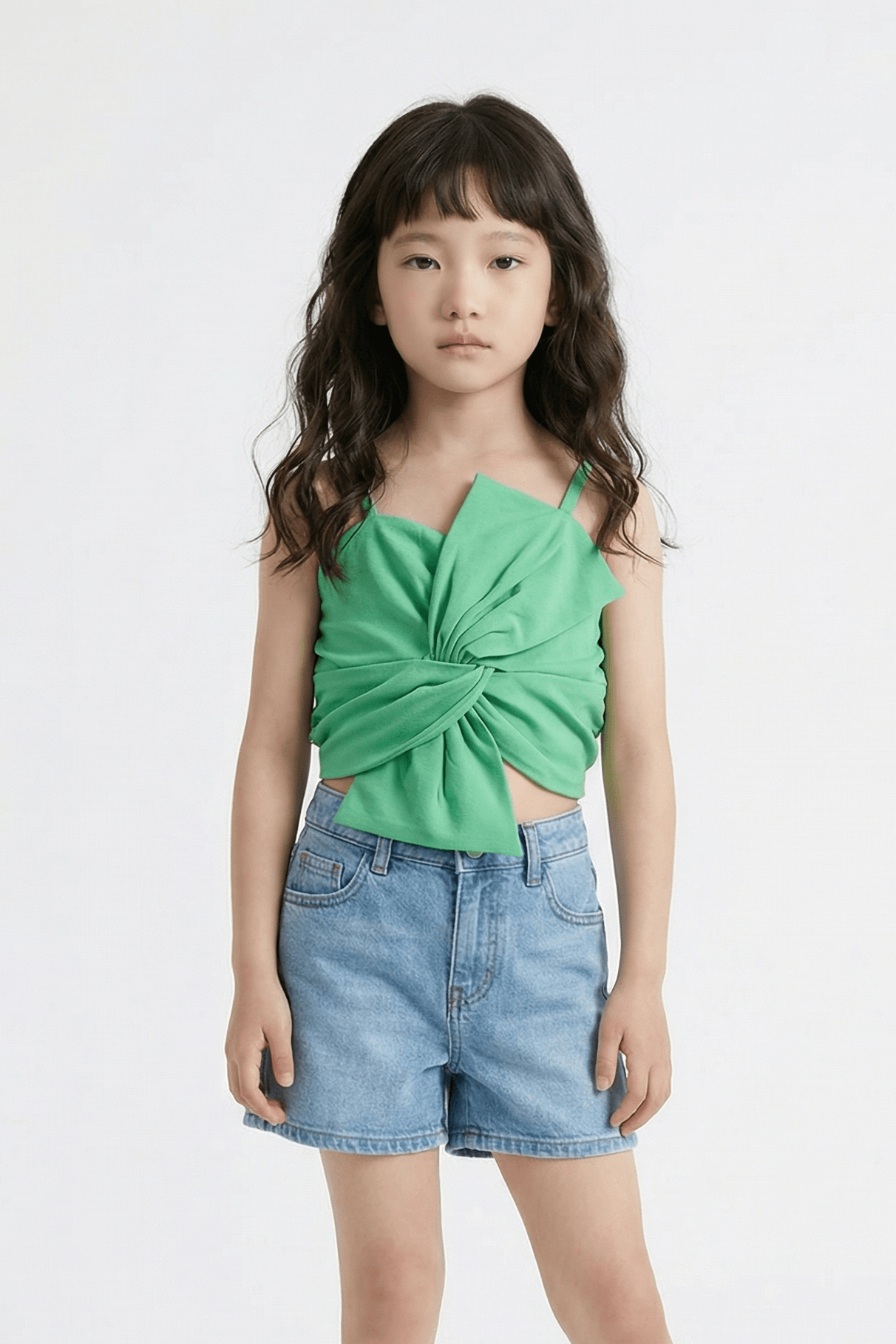 Green woven sleeveless statement crop top featuring a solid design with an eye catching twist bow detail